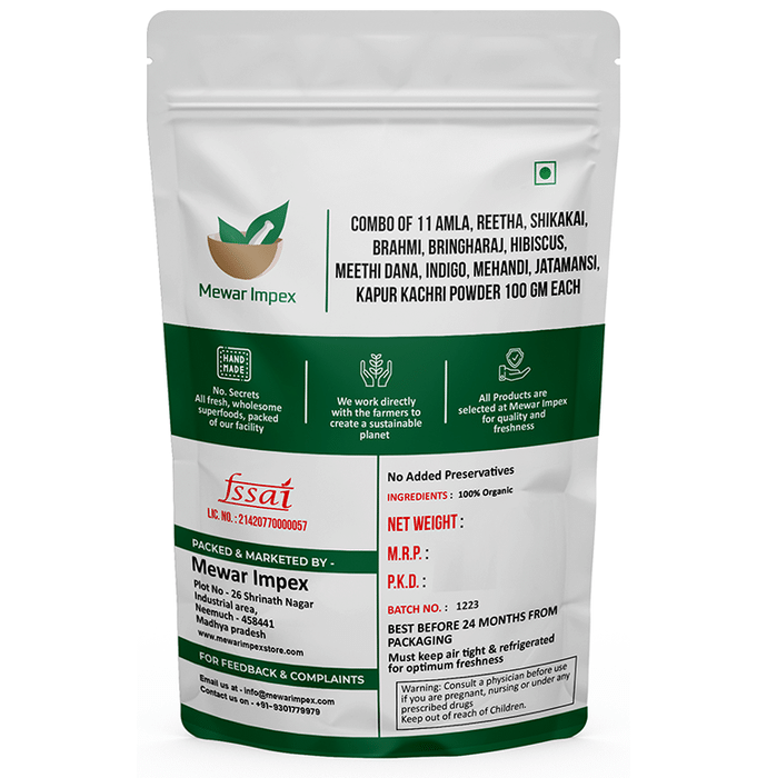 Mewar Impex Combo of 11 Shikakai, Amla, Reetha, Bhringraj, Brahmi, Hibiscus, Methi Dana, Indigo, Kaunch Seed, Jatamansi & Mehendi Powder (100gm Each) Reetha is extensively used to make natural hair care products as it makes hair shiny, healthy and lustrous. Shikakai is beneficial in improving hair health. Meethi dana powder has high amounts of dietary fibre. This makes it nutritious and beneficial for the body. Shikakai is useful for people with dandruff issues. Amla powder contains other essential nutrients that can be beneficial for maintaining good eyes, body and hair. Bhringraj powder is a highly useful ayurvedic system of medicine that is used for the treatment of several health complications. Brahmi powder is a herbal and natural soft powder created by grinding dried Brahmi leaves. Hibiscus powder is packed with antioxidants which are helpful in scavenging free radicals from the body cells. Indigo Powder is helpful in promoting healthy hair. Kaunch seed powder is beneficial in treating neurological disorders. Jatamasi Powder acts as a brain tonic as it promotes brain functions by preventing cell damage. Mehndi Powder is an ayurvedic product that has been formulated to control dandruff and clear the scalp well. | Key Ingredients: Organic shikakai powder Organic reetha powder Organic amla powder Organic bhringraj powder Organic Brahmi powder Organic hibiscus powder Organic methi dana powder Organic indigo powder Organic kaunch seed powder Organic jatamansi powder Organic mehndi powder | Key Benefits: | Reetha powder Reetha can be mixed with warm water to form a paste which can be used to massage the scalp to help manage dandruff Helps to remove lice from the scalp due to its insecticidal property Reetha (along with amla) can be applied to the hair to help control greying of hair and also stimulate better hair growth | Shikakai powder Assist in controlling hair fall and dandruff Encompasses cleansing and antifungal properties It facilitates shine to the hair as well as prevents its greying Shikakai can be used in the treatment of constipation | Amla powder It may be useful as an excellent home remedy for hyperacidity and stomach ulcers Its anti-inflammatory properties can reduce stomach acid levels and soothe inflammation Consumption of amla with honey everyday checks acidity purifies the blood and keeps the body cool | Bhringraj powder Rejuvenates every cell in the body and therefore improves functions of the vital organs Contains anti-inflammatory properties which reduce fever and are used as a pain reliever Improves blood flow to the liver and treats ailments related to kidneys and liver diseases Regulates blood pressure and lowers cholesterol levels and effectively prevents heart failure | Brahmi powder It increases the length and volume of hair Aids in becoming stress-free and relaxed Beneficial for the brain as it enhances clarity, intelligence and other brain functions It nourishes and rejuvenates the hair tropically | Hibiscus powder Hibiscus is known to contain antioxidant properties It may assist in lowering the blood pressure and blood fat levels It may promote liver health It is useful in fighting bacterial attack | Methi dana powder Treats joint pain and promotes strong and healthy bones It helps to control the blood sugar levels in the body This powder helps to relieve muscle pain caused by intense workouts | Indigo powder Useful in natural hair darkening and rejuvenation Helps to prevent premature greying of hair Facilitates hair growth and treat baldness | Kaunch beej powder Black Kaunch Seeds are known to treat neurological disorders Assists in improving the immunity level of the body Black Kaunch Seeds contain aphrodisiac action Useful in improving energy and endurance level | Jatamansi powder Assist in improving memory and brain functions Provides relief in the condition of anxiety and insomnia Helps to prevent wrinkles and treats skin infections It promotes healthy growth and improves hair strength | Mehndi powder This powder helps to reduce dandruff and gives a clear scalp It helps to repair the split ends and gives deep nourishing to dry hair problems Makes the hair stronger, thicker and lustrous providing minimum damage | Directions For Use: Read the label carefully before use. | Safety Information: Read the label carefully before use Store in a cool and dry place away from direct sunlight Keep out of reach of children