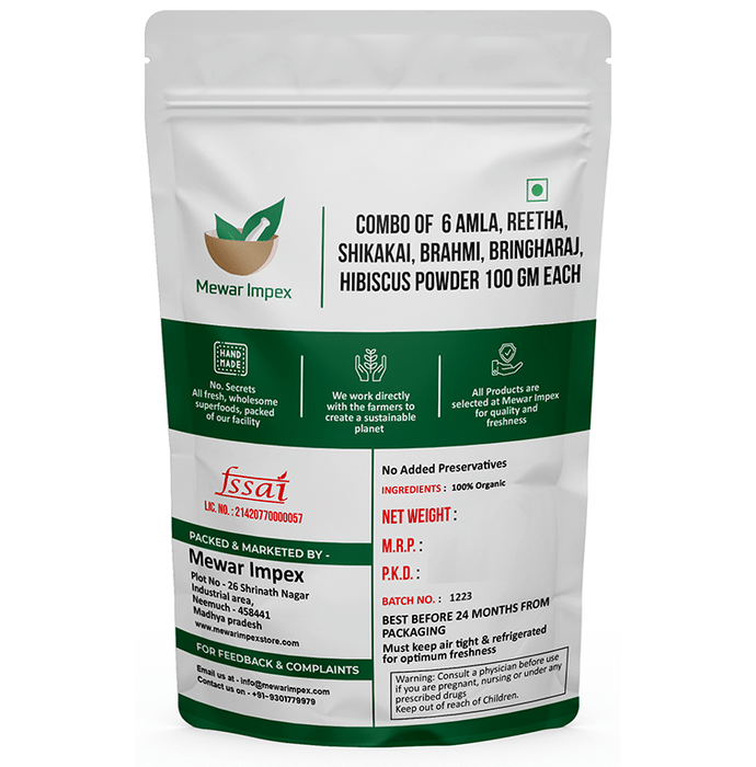 Mewar Impex Combo of 6 Shikakai, Amla, Reetha, Bhringraj, Brahmi & Hibiscus Flower Powder (100gm Each) Reetha is extensively used to make natural hair care products as it makes hair shiny, healthy and lustrous. Shikakai is beneficial in improving hair health. Shikakai is useful for people with dandruff issues. Amla Powder contains other essential nutrients that can be beneficial for maintaining good eyes, body and hair. Bhringraj powder is a highly useful ayurvedic system of medicine that is used for the treatment of several health complications. Brahmi powder is a herbal and natural soft powder created by grinding dried Brahmi leaves. It is known for maintaining healthy, nourished and soft hair. Hibiscus powder is packed with antioxidants which are helpful in scavenging free radicals from the body cells. | Key Ingredients: Organic shikakai powder Organic amla powder Organic hibiscus flower powder Organic Brahmi powder Organic bhringraj powder Organic reetha powder | Key Benefits: | Reetha powder Reetha can be mixed with warm water to form a paste which can be used to massage the scalp to help manage dandruff Helps to remove lice from the scalp due to its insecticidal property Reetha (along with amla) can be applied to the hair to help control greying of hair and also stimulate better hair growth | Shikakai powder Assist in controlling hair fall and dandruff Encompasses cleansing and antifungal properties It facilitates shine to the hair as well as prevents its greying Shikakai can be used in the treatment of constipation | Amla powder It may be useful as an excellent home remedy for hyperacidity and stomach ulcers Its anti-inflammatory properties can reduce stomach acid levels and soothe inflammation Consumption of amla with honey everyday checks acidity purifies the blood and keeps the body cool | Bhringraj powder Rejuvenates every cell in the body and therefore improves functions of the vital organs Contains anti-inflammatory properties which reduce fever and are used as a pain reliever Improves blood flow to the liver and treats ailments related to kidneys and liver diseases Regulates blood pressure and lowers cholesterol levels and effectively prevents heart failure | Brahmi powder It increases the length and volume of hair Aids in becoming stress-free and relaxed Beneficial for the brain as it enhances clarity, intelligence and other brain functions It nourishes and rejuvenates the hair tropically | Hibiscus powder Hibiscus is known to contain antioxidant properties It may assist in lowering the blood pressure and blood fat levels It may promote liver health It is useful in fighting bacterial attack | Directions For Use: Read the label carefully before use. | Safety Information: Read the label carefully before use Store in a cool and dry place away from direct sunlight Keep out of reach of children