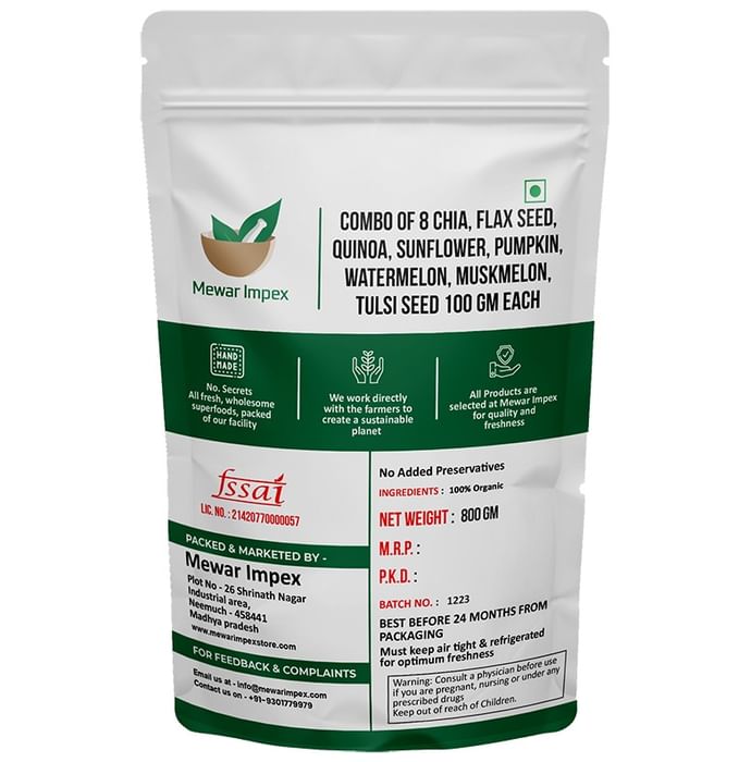 Mewar Impex Combo of 8 Muskmelon, Chia, Pumpkin, Basil, Sunflower, White Sesame & Watermelon Seeds (100gm Each) Muskmelon seeds help to sharpen eyesight as well as reduce the risk of developing cataracts. Chia Seed is known to be the highest source of protein available in the form of a plant. Pumpkin seeds are little powerhouses of nutrients and health benefits. Basil seeds are known as a miracle food because they aid in metabolism, skin and hair wellbeing, blood regulation, body cooling, stress relief, and preventing certain infections. Sunflower seeds are harvested from the flower head of the sunflower plant. White sesame seeds contain a good source of fibre that can improve digestion. Watermelon Seeds are a rich source of proteins, vitamins, omega 3 and omega 6 fatty acids, magnesium, zinc, copper, potassium and more. | Key Ingredients: Muskmelon seeds Chia seeds Pumpkin seeds Basil seeds Sunflower seeds White sesame seeds Watermelon seeds | Key Benefits: | Muskmelon seeds Muskmelon seeds are a rich source of protein Enriched with vitamins such as vitamin A, C and E They improve bone density They protect against diabetes and leads to a healthy heart | Chia seeds It contains mucilaginous fibre which is helpful for those who are trying to lose weight Chia seeds are also useful in maintaining the body's overall health as they are a rich source of omega-3 Fatty acids It has an abundance of minerals and vitamins Chia seeds are a good source of protein | Pumpkin seeds Pumpkin seed may support blood sugar balance It may help to regulate blood pressure These seeds may help you sleep better Pumpkin seeds promote heart health | Basil seeds Basil seeds are known as a miracle food because they aid in weight loss and metabolism Promotes the wellbeing of the skin and hair strength Helps in regulating the blood and relieving the stress Supports in building healthy bones, lowering blood pressure, improving vision, lowering cholesterol and preventing certain infections | Sunflower seeds Sunflower seeds improve heart health Sunflower seeds support the immune system They boost energy levels, keeping you active They are beneficial for heart diseases and blood pressure | White sesame seeds It is an excellent source of copper, calcium, omega fatty acid, iron, magnesium, zinc, phosphorus and selenium It is rich in fibres and can help improve the functioning of the digestive system Has a nutty and earthy flavour that makes the food tastier Sesame seeds can be used to extract oil and can be used as a topping in breadsticks and burger buns | Watermelon seeds Watermelon seeds promote skin health Watermelon seeds are good for hair They help maintain blood sugar levels They boost energy levels and prevents osteoporosis | Directions For Use: Read the label carefully before use. | Safety Information: Read the label carefully before use Store in a cool and dry place away from direct sunlight Keep out of reach of children