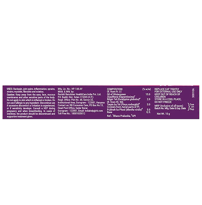 Moov Pain Relief Cream helps in relieving pain and provides muscle relaxation and helps in quick recovery. These ingredients penetrate deep into the skin to generate warmth and are recognised for their soothing qualities. Moov Pain relief cream is an analgesic (or pain-relieving) ointment made using 100% ayurvedic ingredients helps in relaxing muscle stiffness and relieving pain effectively. Moov Pain Relief Cream quickly and effectively relieves muscles pain, neck pain, back pain and inflammation. | Key Ingredients of | Moov Pain Relief Cream: Turpentine Oil Nilgiri Oil Wintergreen Oil Mint Extract | Key Benefits of | Moov Pain Relief Cream: Moov Pain Relief Cream reduces irritation and swelling around the affected area The mint leaves in Moov pain relief cream gives a cooling effect to the pain and treat the sore muscles and relieve joint aches Turpentine oil helps to alleviate tissue discomfort and relax muscles Eucalyptus oil in Moov pain relief cream is a great massage lotion for joint pain and provides a relaxing warmth Moov's pain relief cream comes with a single quick absorption formula that enables it to act fast and clear pain | Directions For Use: Spread two pulp full of Moov Pain Relief Cream on the affected area to form a thin film Massage gently to facilitate the penetration | Safety Information: Keep out of the reach and sight of children Read the label carefully before use Store in a cool dry place and away from direct sunlight For external use only