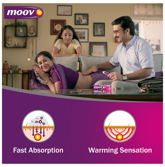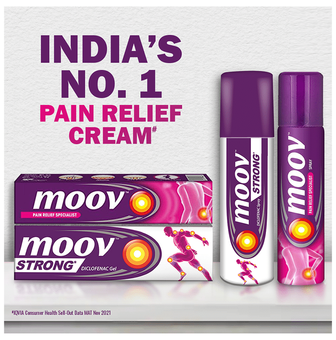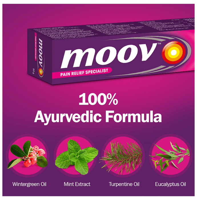 Moov Pain Relief Cream for Back Pain, Joint Pain, Knee Pain, Muscle Pain Moov Pain Relief Cream helps in relieving pain and provides muscle relaxation and helps in quick recovery. These ingredients penetrate deep into the skin to generate warmth and are recognised for their soothing qualities. Moov Pain relief cream is an analgesic (or pain-relieving) ointment made using 100% ayurvedic ingredients helps in relaxing muscle stiffness and relieving pain effectively. Moov Pain Relief Cream quickly and effectively relieves muscles pain, neck pain, back pain and inflammation.