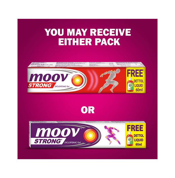 Moov Strong Diclofenac Pain Relief Gel with 60ml Dettol Antiseptic Liquid Free Moov Strong Diclofenac Pain Relief Gel acts fast and gives long lasting relief from pain. It provides relief from joint pain, backache, muscle stiffness, pain, swelling and inflammation due to musculo-skeletal disorders (such as sprains, strains, tendonitis, bursitis, hand, neck, shoulder pain and sciatica) Moov Strong Diclofenac Gel contains diclofenac, which is the No. 1 doctor-recommended active ingredient for acute pain relief. It targets the source of pain, provides warmth and gives quick and long lasting relief from pain.