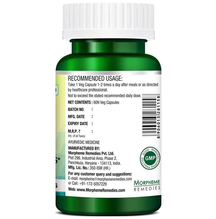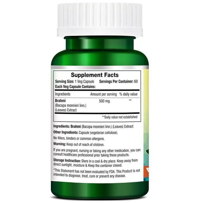Morpheme Brahmi Capsule is good for overall health of the brain. It is suitable for all age groups and is 100% vegetarian. It has no side effects. | Key Ingredients: Pure extract of Brahmi (Bacopa monnieri linn) | Key Benefits: Helps in cognition enhancing activity and improves learning power Rejuvenates intellectual power It is adaptogenic and has neuro-protective power Free from additives, fillers, binders and synthetic products | Directions for Use: 1 capsule 1-2 times a day before meals or as directed by healthcare professional | Safety Information: Store in a cool, dry and dark place Protect from direct sunlight Read the label carefully before use Do not exceed the recommended dose Keep out of the reach of children