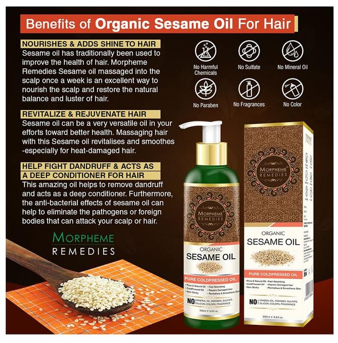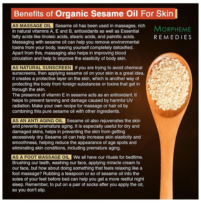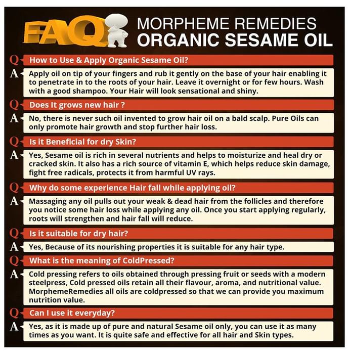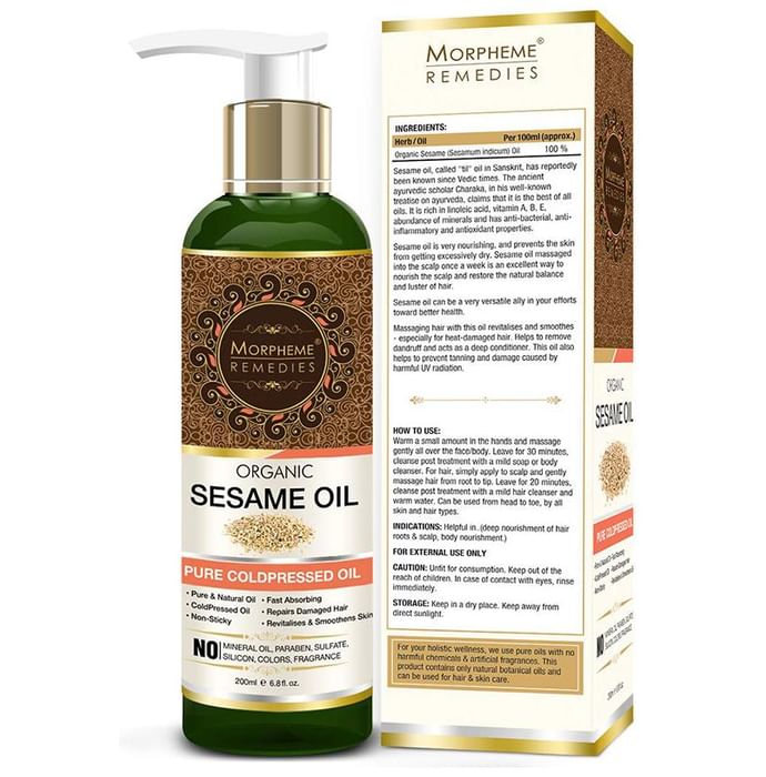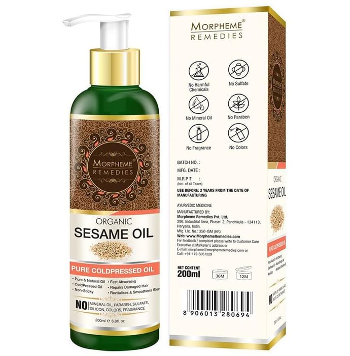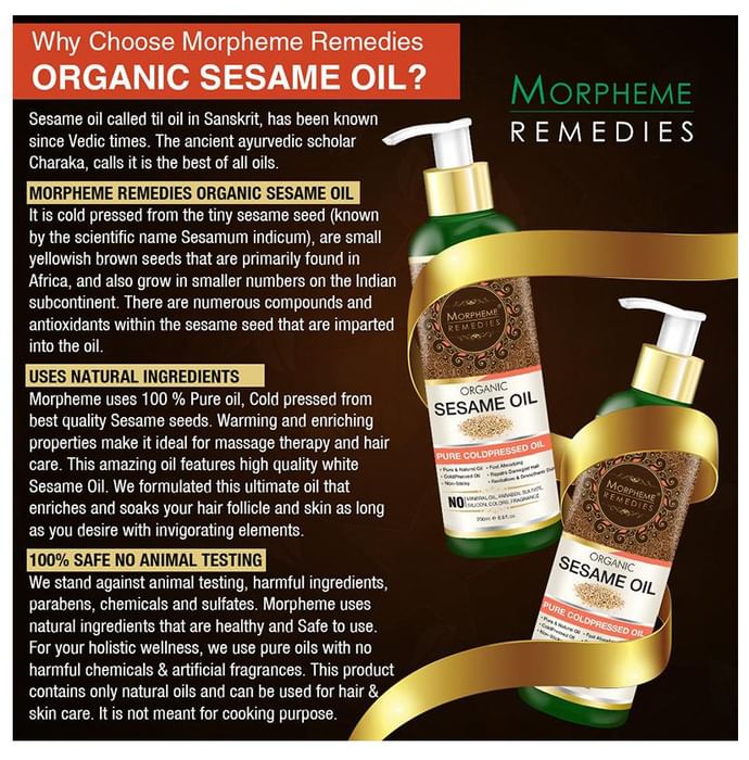 Morpheme Organic Sesame Oil is rich, warming and unrefined, which preserves the full nutritional benefits of the sesame seed. It provide warming and enriching properties and is ideal for massage therapy and aromatherapy. Sesame oil is very nourishing, and prevents the skin from getting excessively dry. | Key Ingredients: Sesame seed oil | Key Benefits: Sesame oil is popularly used for hair growth and to maintain scalp health It is enriched with Vitamin E, B complex, and minerals such as magnesium, calcium, phosphorus and protein that strengthens the hair from the roots and deeply nourishes It helps prevent premature graying, retaining the natural color of your hair for longer Sesame oil improves the circulation of blood in the scalp, and it thereby promotes hair growth It forms a protective coat around the hair shaft, keeping it safe from the harmful rays of the sun Hexane free, Chemicals free, Synthetic ingredients free | Directions For Use: Gently apply oil on scalp and massage it for 15-20 minutes before rinse off with warm water. | Safety Information: For external use only Read the label carefully before use Store in a cool and dry place, away from sunlight Keep out of the reach of children