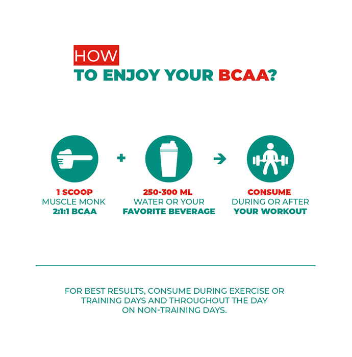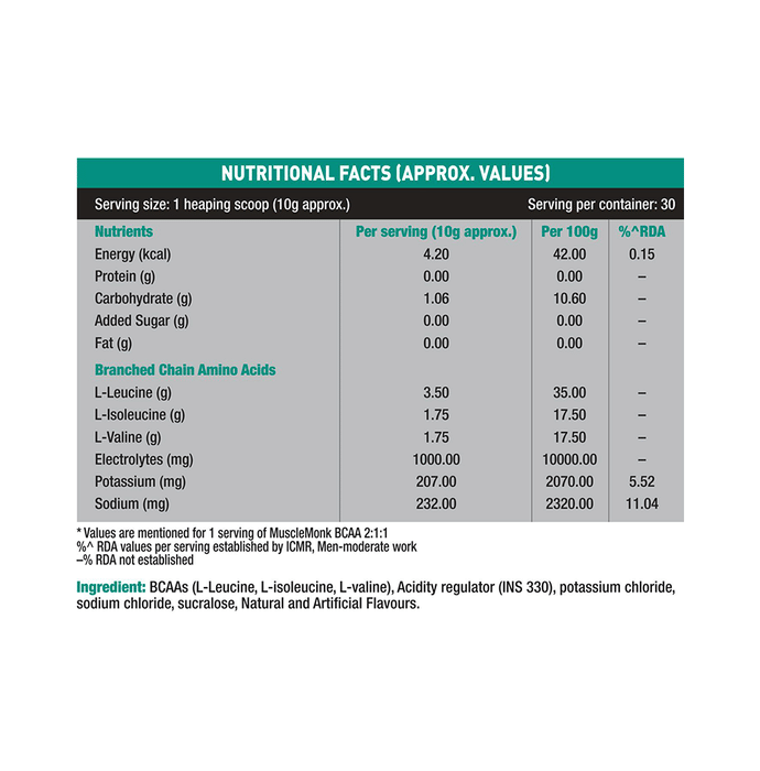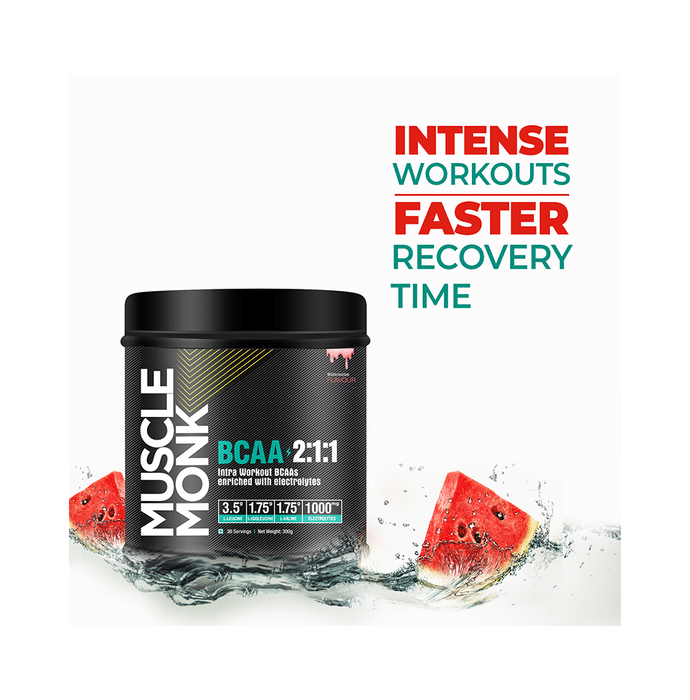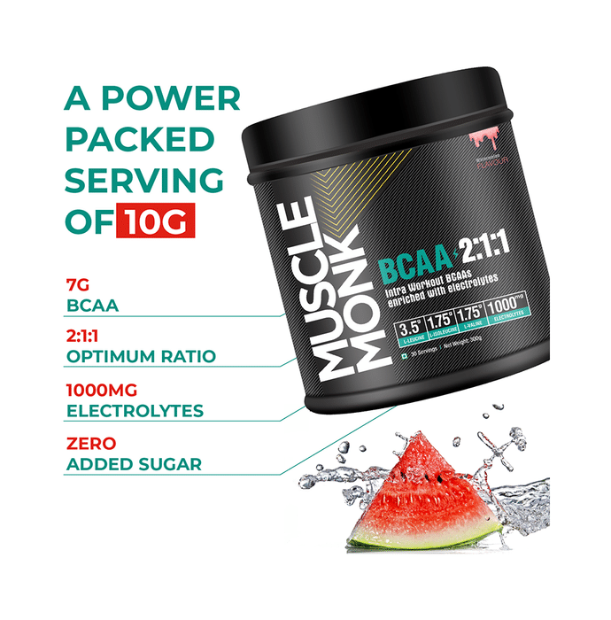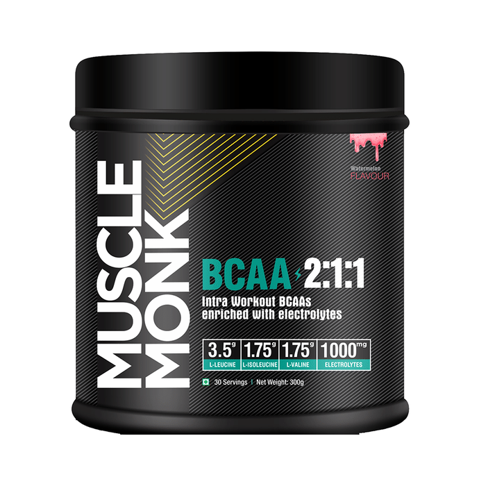 Read the label carefully before use | Keep out of reach of children | Store in a cool and dry place away from direct sunlight Muscle Monk BCAA 2:1:1 Watermelon (Fermentis Life Sciences Pvt Ltd) Muscle Monk BCAA 2:1:1 Watermelon is a premium intra-workout supplement of branched-chain amino acids. It plays a key role in protein synthesis and delivers L-leucine, L-isoleucine and L-valine for faster muscle recovery after strenuous workouts. Key Ingredients: BCCAs - L-leucine, L-isoleucine and L-valine | Potassium chloride | Sodium chloride | Sucralose | Natural and artificial flavours Key Benefits: It boosts energy for workouts | It prevents muscle breakdown | It aids muscle recovery | It promotes muscle development while supporting lean muscle mass | The watermelon flavour is refreshing and crisp | The product is FDA approved Directions For Use: Use as directed.