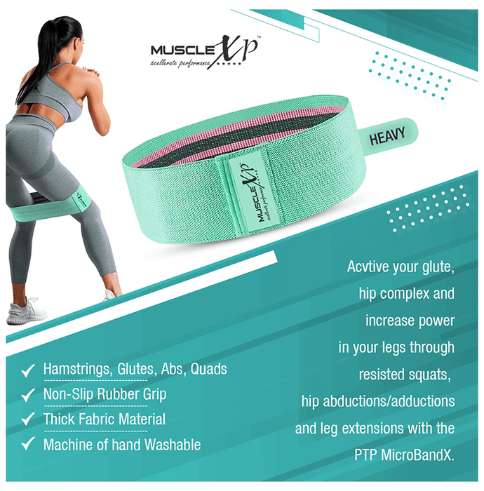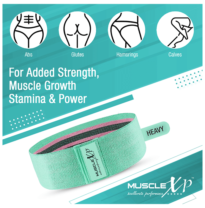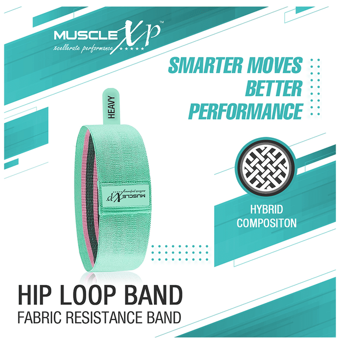 MuscleXP Dr Fitness+ Hip Loop Fabric Resistance Band Green Heavy helps in shaping hips and slimming legs. It is made up of thick fabric, has a nonslip grip, and is suitable for different age groups from kids, to young and elderly people. It is useful for exercises like warmups, stretching, squatting, pilates, cross-fit workouts, hip bend leg pressure, hip abduction, hip bends, and many others. | Uses: They are useful for toning the abdomen, hamstring, glutes, and calves. They are highly efficient for home workouts. | Product Features and Specifications: It is made up of thick fabric and has a nonslip grip It gives you support for a wide range of exercises and tranings It is ideal for home-based strength training It can increase muscle strength and is also ideal for weight lifting, cross-fit, powerlifting, and strength training | Directions For Use: Use as directed on the label or as prescribed by the physician. | Safety Information: Read the label carefully before use Store in a cool dry place away from direct sunlight Keep out of reach of the children