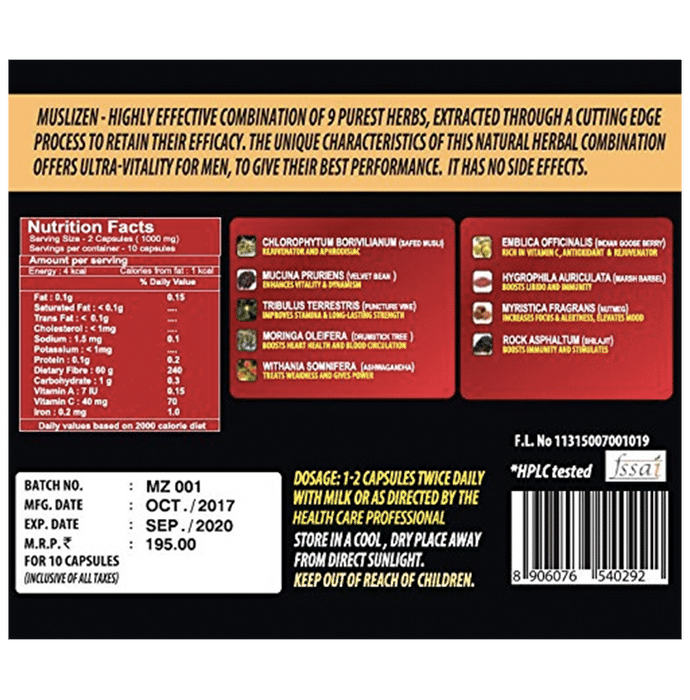 MusliZen Herbal Capsule contains Chlorophytum borivilianum (Safed Musli), Mucuna pruriens (Velvet Bean), Moringa oleifera (Drumstick Tree), Withania somnifera (Ashwagandha), Emblica officinalis (Indian Gooseberry), Tribulus terrestris (Puncture Vine), Hygrophila auriculata (Marsh Barbel), Myristica fragrans (Nutmeg), and Rock asphaltum (Shilajit) | - MusliZen has a 9 ingredient combination provides the goodness of age-old ayurvedic herbs, combined with a hi-tech extraction process to give 100% purity | Key benefits/uses of MusliZen Herbal Capsule: | - Boosts vitality, stamina and energy through its combination of 9 Ayurvedic herbs | - Also helps to improve sexual performance and satisfaction for both partners | - If taken in the correct dose it does not cause any side effects | Direction for use/Dosage: | - Take 2 MusliZen Herbal Capsules every evening with a glass of warm milk | - Minimum course of 21 days to be taken | - Up to 4 capsules, a day can be consumed | Indications: | - Loss of stamina, vitality and energy | Recommendation: | - For 18 years above only | Storage instruction: | - Should be stored away from direct sunlight | Safety information: | - Read the label carefully before use | - Do not exceed the recommended dose | - Keep out of the reach and sight of children