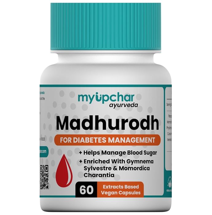 Myupchar Ayurveda Diabetes Control Combo Pack of Yakritas Vegan Capsule & Madhurodh Vegan Capsule (60 Each) | Yakritas Vegan Capsule helps in maintaining a healthy heart. It helps support disorders of the liver and upper respiratory tract and reduce fevers. | Madhurodh Vegan Capsule (60 Each) is enriched with gymnema, sylvestre and charantia. It helps manage blood sugar levels in the body. | Key Ingredients: | Yakritas Vegan Capsule Pichroza kurrao Phyllanthus nirruri | Madhurodh Vegan Capsule (60 Each) Gymnema Sylvestre Charantia | Key Benefits: | Yakritas Vegan Capsule It helps manage disorders of the liver and upper respiratory tract It reduces fever It is a liver support formulation | Madhurodh Vegan Capsule (60 Each) It helps lower blood sugar levels It reduces sugar cravings by making sweet foods taste less appealing It improves good cholesterol levels | Directions for Use: As directed by the physician | Safety Information: Read the label carefully before use Store in a cool and dry place, away from sunlight Keep out of reach of children Use under medical supervision Don’t exceed the recommended dosage