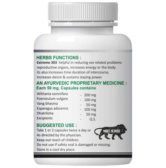 Natural Combo Pack of Extreme 303, 500mg Capsule(60) & Male Pro 15ml is a strong libido enhancer and may be useful in improving the feelings of sexual desire in men and to increase libido. It may also work as a powerful sperm enhancer which significantly increases sperm counts and sexual power of men. A perfect capsules formulated to help combat male sexual disorders like impotency, premature ejaculation problem, and erectile dysfunction. | Key Ingredients: Withania Somnifara Foeniculum Vulgare Vang Bhasms | Key Benefits: | Male Pro 15ml It strengthens the male genitalia It helps the man last longer during intercourse It helps in enhancing sexual drive Extreme 303 It may help in the management of testosterone level May help in penis enlargement It may help to tone up the muscles of penis It may help in the management of sperm count | Directions For Use: Extreme 303 : Take one or two capsules twice a day or as directed on the label Male Pro 15ml : One drop any time or as directed on the label | Safety Information: Read the label carefully before use Store in a cool dry place away from direct sunlight Keep out of reach of the children