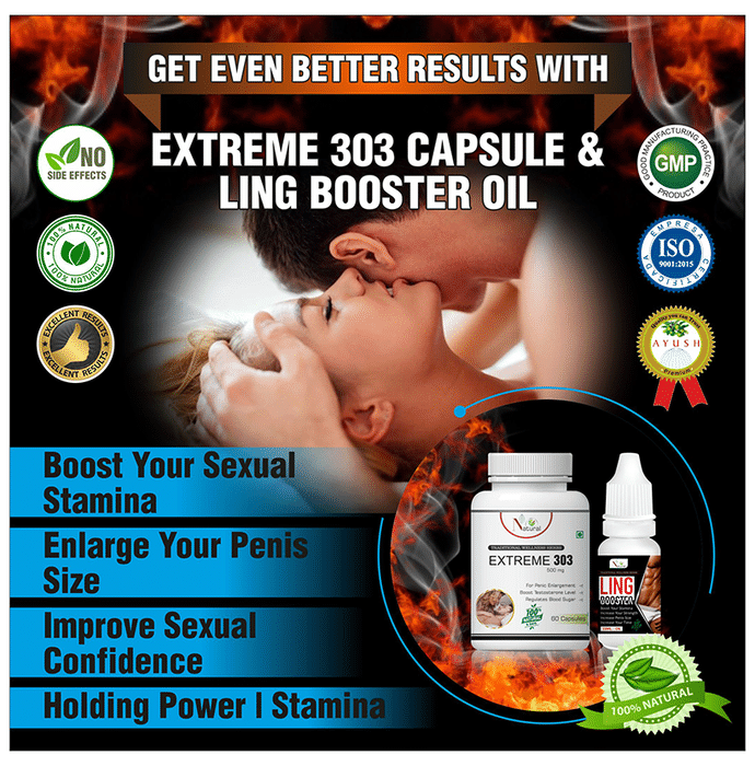 Natural Combo Pack of Extreme 303, 500mg Capsule (60) & Ling Booster Oil 15ml may help to promote natural testosterone release in the body to enhance the muscle build up. It enhances strength and performance naturally. It also enhances harder erection and enhances vigor and vitality. | Key Ingredients: Withania Somnifara Foeniculum Vulgare | Key Benefits: | Extreme 303 It may help in the management of testosterone level May help in penis enlargement It may help to tone up the muscles of penis | Ling Booster Oil It is useful in boosting stamina It may be helpful in increasing penis size It helps the individual last longer | Directions For Use: Use as directed on the label. | Safety Information: Read the label carefully before use Store in a cool dry place away from direct sunlight Keep out of reach of the children