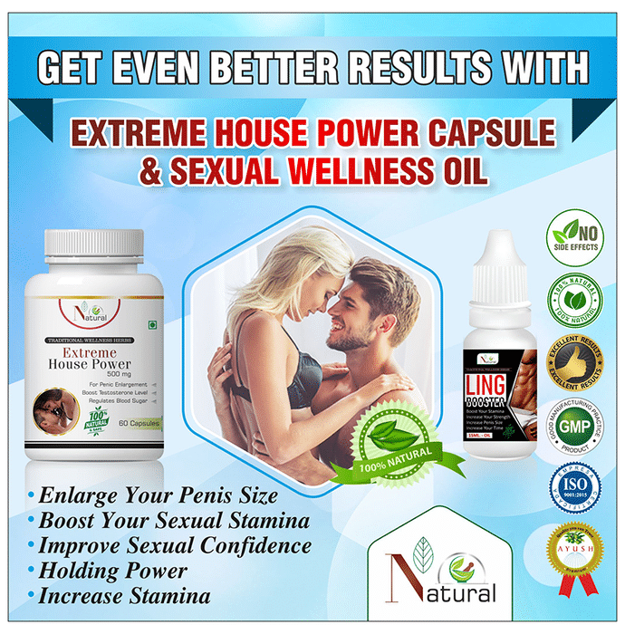 Natural Combo Pack of Extreme House Power 500mg, 60 Capsule & Ling Booster Oil 15ml may work as a libido enhancer. It may help to improve the feelings of sexual desire in men and manage libido. It may help in the management of sperm counts and sexual power of men. It may help in the treatment of male sexual disorders like impotency, premature ejaculation problem, erectile dysfunction. In addition to this, it used in the treatment of natal and postnatal problems. It also acts as a natural immunity enhancer and relieves physical weakness. | Key Ingredients: Withania Somnifera Vang Bhasma Esparagus adscenns | Key Benefits: | Extreme House Power It helps to regulate the blood sugar level It may help in the management of testosterone level May help in penis enlargement | Ling Booster Oil It acts as a natural immunity enhancer Helps to enhance the overall strength and stamina of the body | Directions For Use: As directed by the physician. | Safety Information: Read the label carefully before use Store in a cool dry place away from direct sunlight Keep out of reach of the children Use under medical supervision