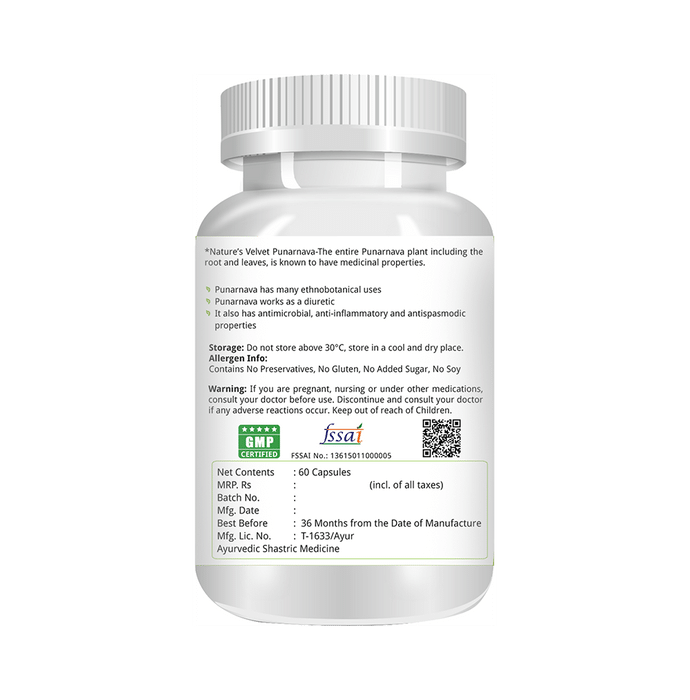 Nature's Velvet Punarnava Pure Extract 500mg Capsule Nature’s Velvet Punarnava Pure extract 500mg Capsule is a powerful antioxidant, ithelps by promoting kidney health and function. It also hasanti-inflammatory effect and supports healthy urine flow.