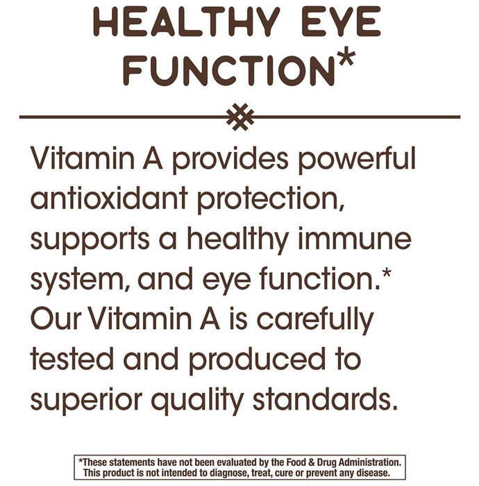 Nature's Way Vitamin A Softgel helps maintain cell membrane integrity. It also plays an important role in proper bone formation, reproduction and vision. It promotes immune health and gives skin a natural glow. It has an abundance of antioxidants that help fight free radical damage. | Key Ingredients: Vitamin A (from fish liver oil and retinyl palmitate) Soybean oil Gelatin (Softgel) Glycerin | Key Benefits: It helps in preventing night blindness It is useful in reducing acne It is useful in strengthening the immune system It is used to support bone health | Directions For Use: Take 1 capsule daily or as directed by the physician. | Safety Information: Read the label carefully before use Do not exceed the recommended dosage Store in a cool and dry place away from direct sunlight Keep out of reach of children