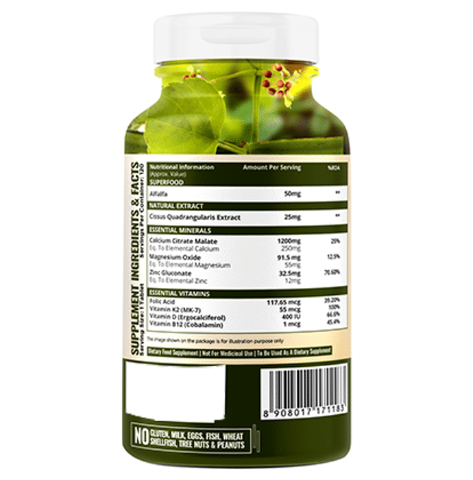 Nature Life Nutrition Tablet Alfalfa Calcium Citrate Malate Vegetarian has the most easily absorbable calcium required by the body and does not lead to calcium deposits, with long-term usage. These capsules are also a rich source of vitamin A, C, E and K4. Alfalfa contains essential minerals such as phosphorus, potassium and iron. NatureLife Nutrition Alfalfa Tablets contain a double dose of vitamin D compared to other calcium supplements, which results in better calcium absorption. Vitamin K2, D, B12, are added to support energy production, while Zinc and Magnesium help develop stronger bones. It supports overall bone and muscle health. | Key Ingredients: Alfalfa Calcium citrate malate Magnesium oxide Zinc gluconate Folic acid Vitamin K2 Vitamin D Vitamin B12 | Key Benefits: Provides muscle support Has anti-inflammatory properties Helps maintain cholesterol Contains easily absorbable calcium | Directions For Use: As directed by the dietician and nutritionist. | Safety Instructions: Read the label carefully before use Store in a cool dry place away from direct sunlight Keep out of reach of the children Use under medical supervision