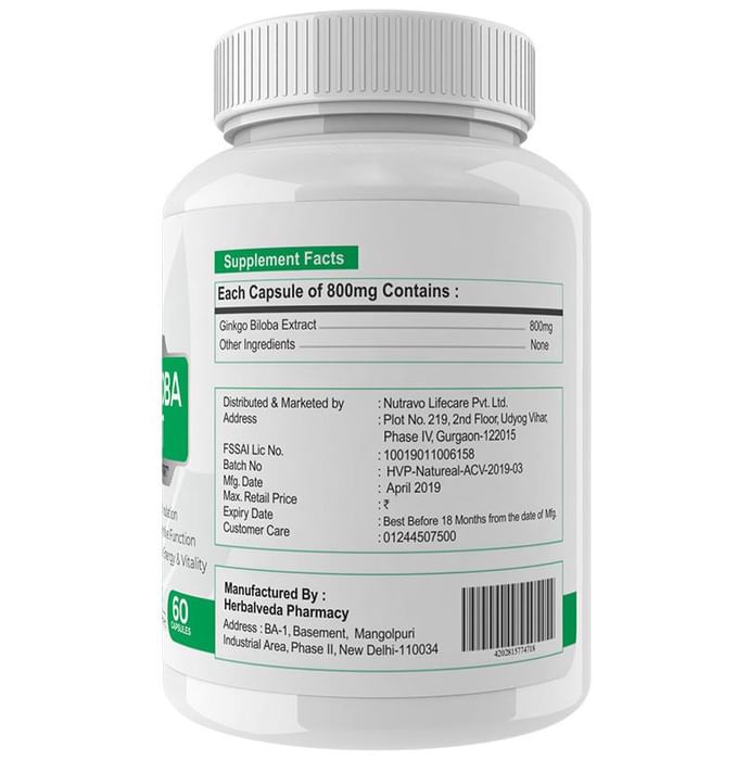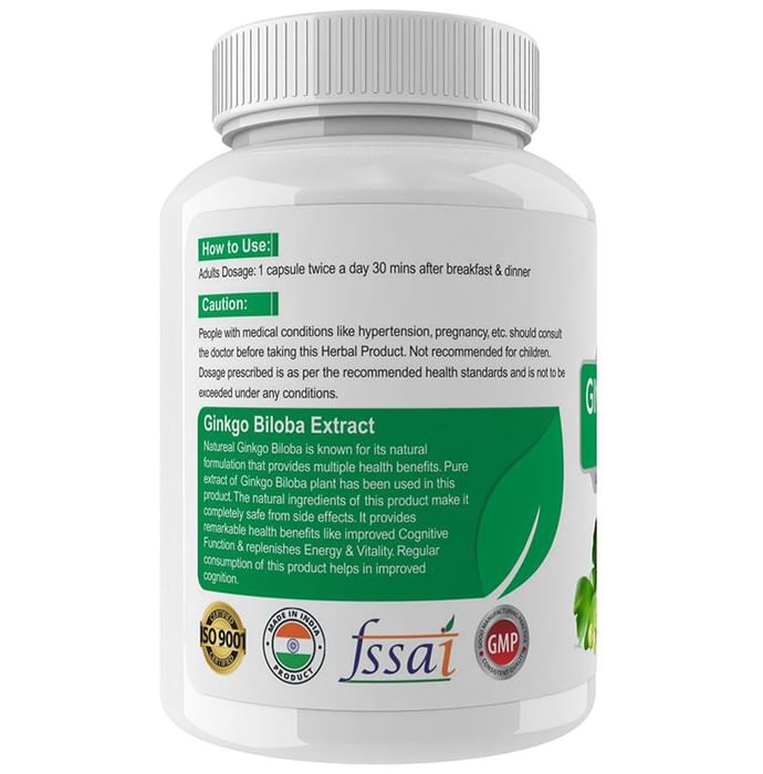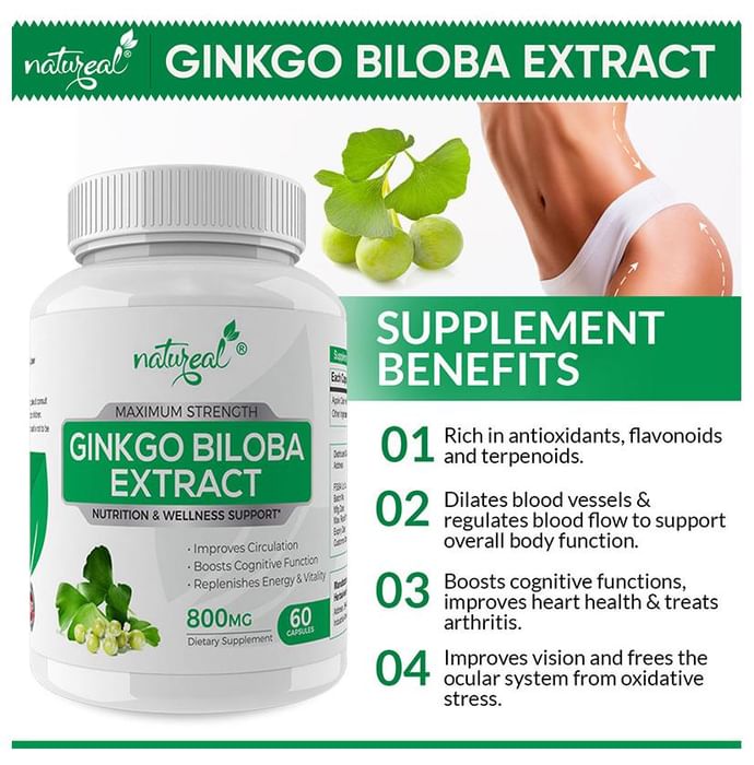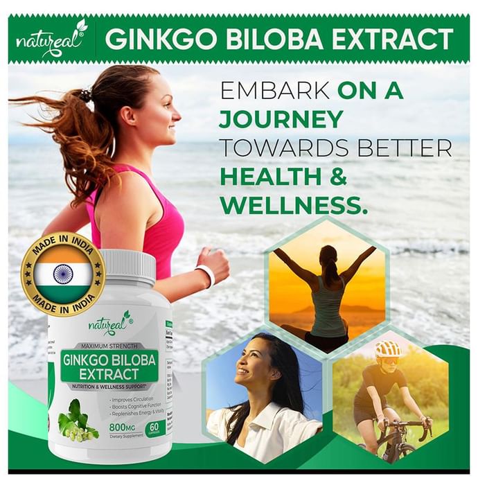 Natureal Ginkgo Biloba Extract 800mg Capsule contains a high level of antioxidants which help to treat arthritis, enhances memory, protects the brain etc. The supplement may have positive effects on cognition, memory, circulation, mood, and oxidative stress. | Key Ingredient: Ginkgo Biloba Extract | Key Benefits: Primarily helpful in strengthening the body, improving muscle strength and energising the body Helps people who want to enhance physical performance without consuming artificial substances Ability to increase blood dilation which stimulates the blood flow to the organ that improves the skin and body conditions Numerous health benefits like healthy cognition increased focus and improved well being Treats health conditions such as a backache, mental illness and joint pain | Directions For Use Take 2 capsules daily, for best results, take 1 capsule twice daily with meals, or as directed by your physician. | Safety Information: Read the label carefully before use Store in a cool dry place away from direct sunlight Keep out of reach of the children Do not exceed the recommended dosage