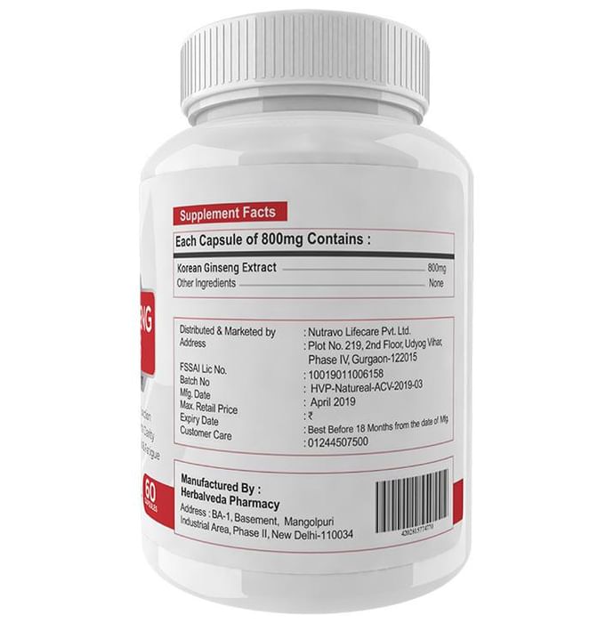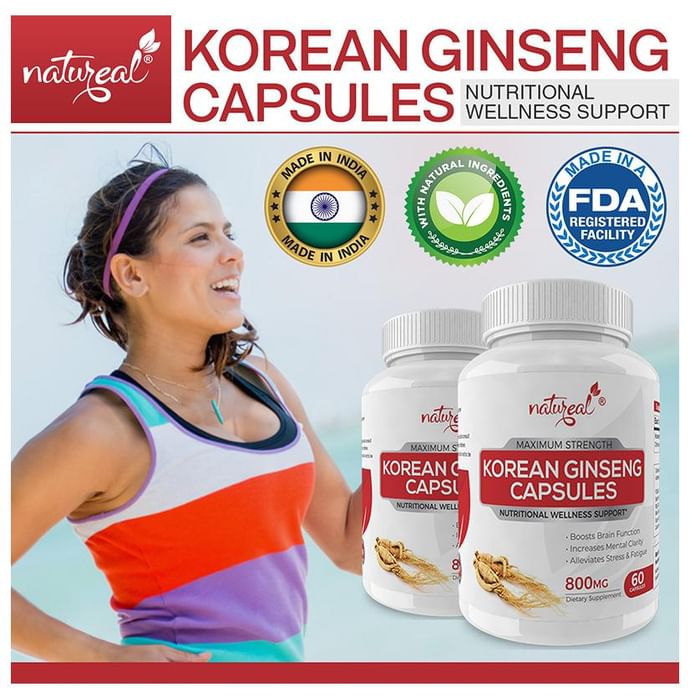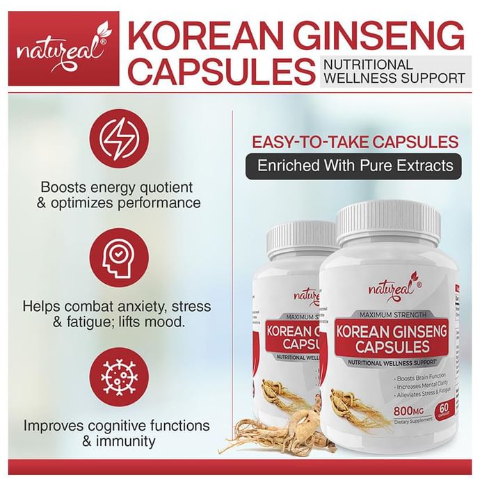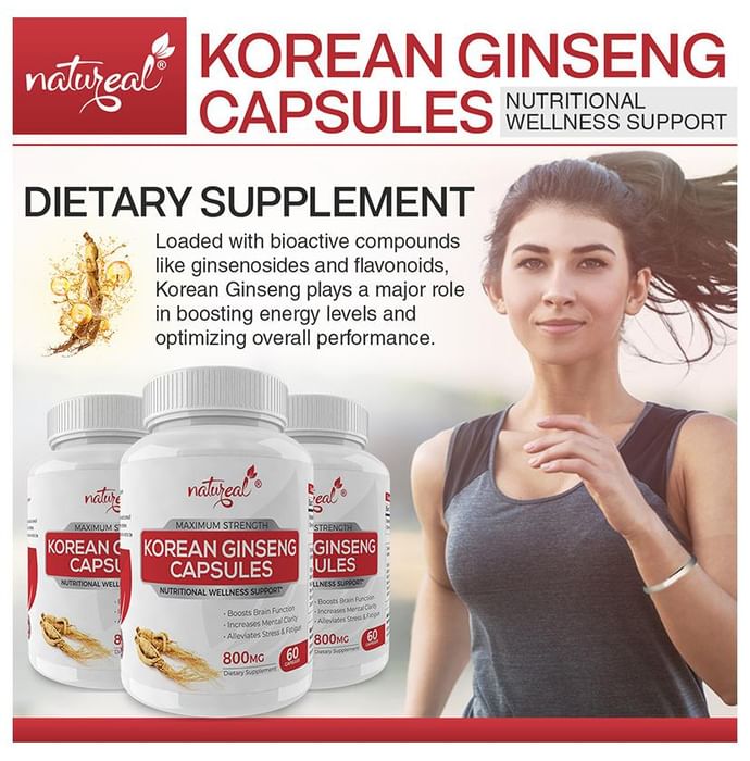 Natureal Korean Ginseng 800mg Capsule Natureal Korean Ginseng 800mg Capsule improves physical as well as mental strength and helps enhance the cognitive abilities of the individual. It helps in reducing the feeling of stress and fatigue while also working as an immunity booster.