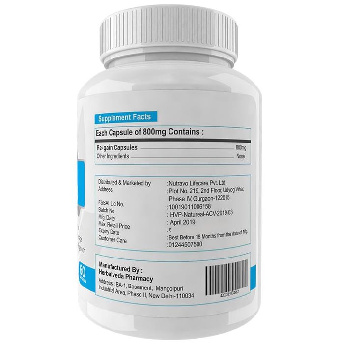 Natureal Re-Gain 800mg Capsule is formulated in order to control hair fall, promote hair growth, strengthen hair follicles & rejuvenate skin. This herbal blend even works on the nutritional needs of the body. It works on energising the body. It is also a great help for rough and weak hair. | Key Ingredients: Herbal Extracts | Key Benefits: An advanced herbal blend that works on hair, nails and skin issues naturally Can provide thick, strong and long hair along with radiant skin and strong body Strength of nails can also be improved and is a one stop solution for multiple hair, skin and nail issues It supports hair growth, adds lustre to hair and repairs hair from tip to ends Activates dormant hair follicles to support new growth of hair Helps to nourish frizzy, dull and thin hair | Directions For Use Take 1 capsule twice a day 30min after breakfast and dinner. | Safety Information: Read the label carefully before use Store in a cool dry place away from direct sunlight Keep out of reach of the children Do not exceed the recommended dosage