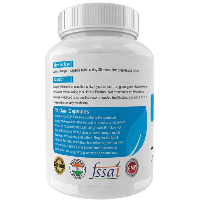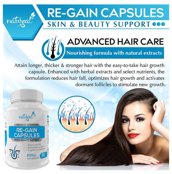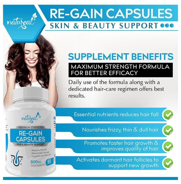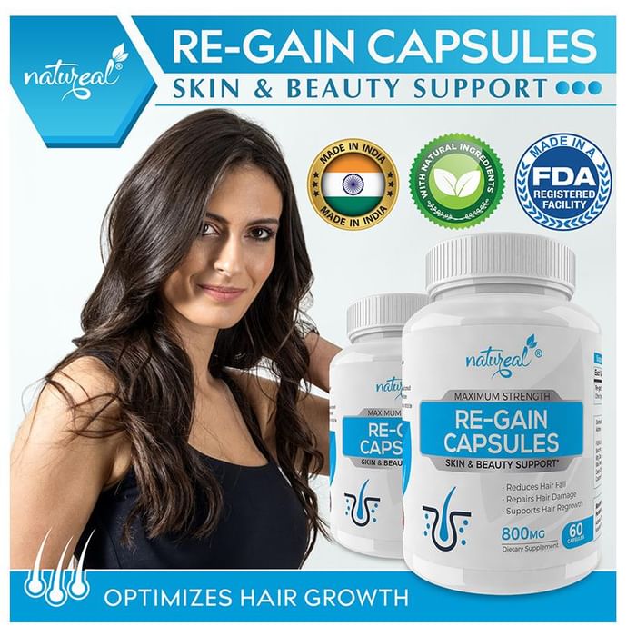 Natureal Re-Gain 800mg Capsule Natureal Re-Gain 800mg Capsule is formulated in order to control hair fall, promote hair growth, strengthen hair follicles & rejuvenate skin. This herbal blend even works on the nutritional needs of the body. It works on energising the body. It is also a great help for rough and weak hair.