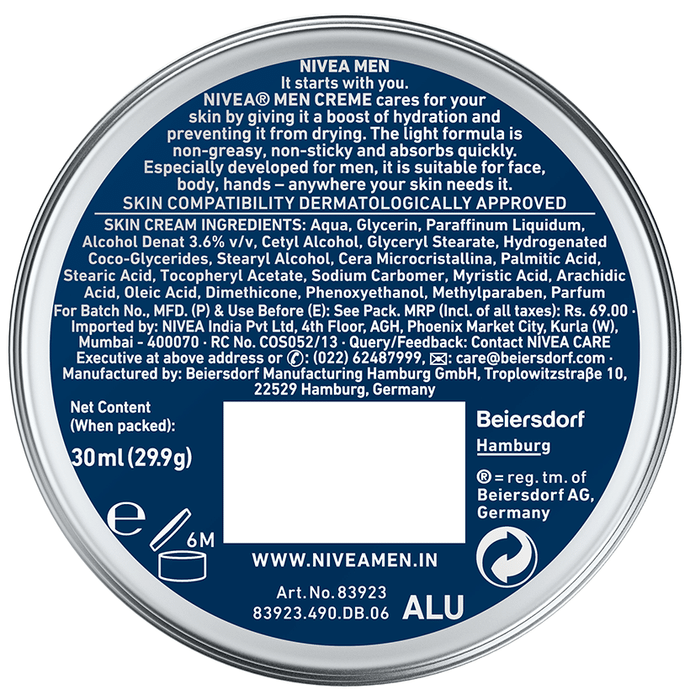 Nivea Men Moisturiser Creme cares for the skin by giving it a boost of hydration and preventing it from drying. The light formula is non-greasy, non-sticky and absorbs quickly. Especially developed for men, it is suitable for face, body, hands – anywhere your skin needs it. | Key Ingredients: Glycerin Mineral Oil Alcohol Denat Stearic Acid Petrolatum Cetyl Alcohol Glyceryl Stearate | Key Benefits: Helps moisturize the skin and prevent excessive drying out of the skin The cream is a non-greasy formulation, ideal for all skin types Helps to provide the skin with awesome hydration making the skin soft and supple | Directions For Use: Scoop the product Rub it on your palms to spread evenly Gently massage all over your face Use daily for moisturised skin | Safety Information: In case of allergic response, discontinue using the product Read the label carefully before use For external use only