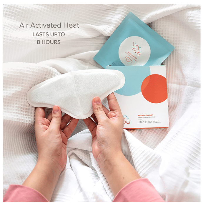 Nua Cramp Comfort Heat Patch Nua Cramp Comfort Heat Patch is a self-heating patch inspired by the function of a hot water bag for cramps during periods. This nua product will not only offer relief to the period pain but also provide a portable solution to carry outdoors. The patch is made with 100% natural and effective ingredients and does not contain any harmful chemicals. The patch should be applied to the underwear and not directly on the skin. Heat is a natural and effective way to reduce pain.