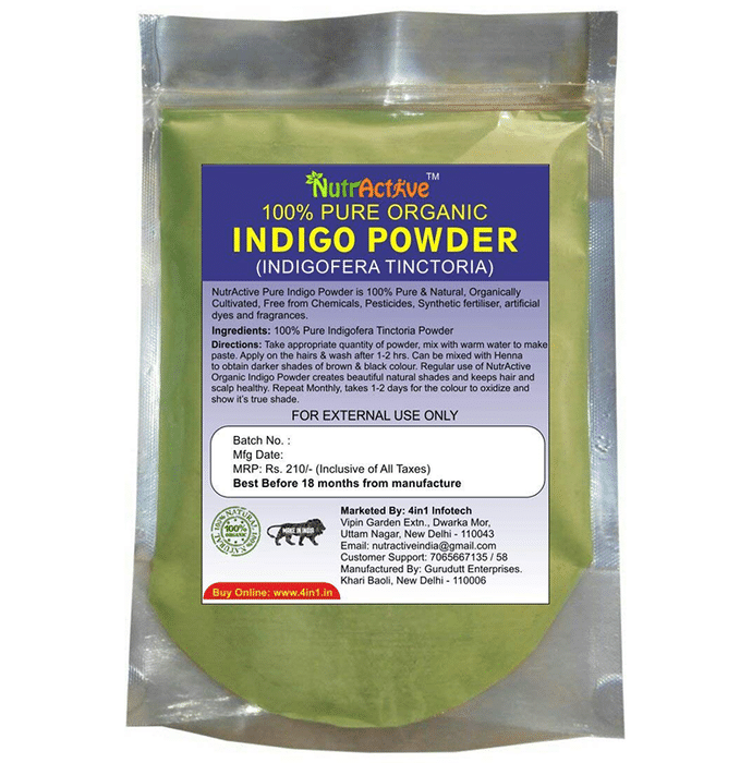 NutrActive Natural Indigo Powder is 100% natural and chemical free hair colorant. It gives a natural black color to the hair and effectively covers gray hair. NutrActive Natural Indigo Powder is a great substitute for modern chemical-based dyes. | Key Ingredients: 100% pure Indigofera Tinctoria powder | Key Benefits: Provides lovely dark brown color to the hair when henna and indigo both applied to hair Adds shine, texture to the hair and keeps the hair and scalp healthy Takes about 24 hrs for the color to oxidize and show true color Also used to dye clothes and get a denim blue color | Directions For Use: Take an appropriate quantity of NutrActive Natural Indigo Powder, mix with warm water to make paste Apply on the hair and wash after 1-2 hours Can be mixed with henna to obtain darker shades of brown and black | Safety Information: For external use only Read the label carefully before use Keep out of the reach of children Store at a cool and dry place Should be protected from direct sunlight