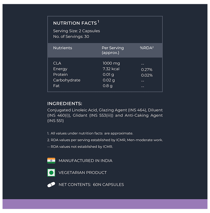 Nutrabay Pro CLA Capsule contains Conjugated Linoleic Acid, a naturally occurring fatty acid. It fuels energy through fat metabolism. It is known to help maintain lean muscle mass and support healthy body composition. | Key Ingredients: Conjugated Linoleic Acid Glazing Agent Diluent Glidant Anti-Caking Agent | Key Benefits: Supports healthy body metabolism It is used to help build muscle mass Fuels energy in the through fat metabolism | Directions For Use: Consume 2 capsules per day before or after meal or as advised by the dietician. | Safety Information: Read the label carefully before use Store in a cool and dry place away from direct sunlight Keep out of reach of the children
