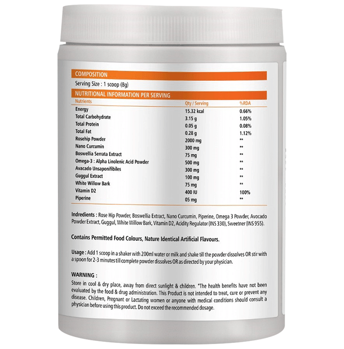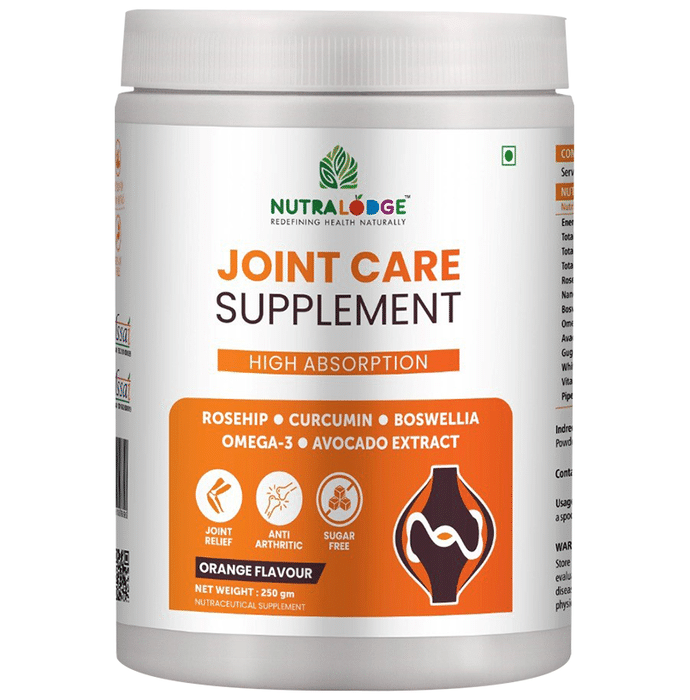Nutralodge Joint Care Supplement Sugar-Free Orange is a high absorption joint care supplement formulated using naturally beneficial ingredients including rosehip, curcumin, boswellia, omega-3 and avocado extract. Beneficial for joint pain relief, it is anti-arthritic, sugar-free and vegan-friendly. Also, its delightful taste makes daily consumption easy and comfortable for everyone. | Key Ingredients: Rosehip powder Nano curcumin Boswellia serrata extract Omega-3 Alpha linoleic powder Avocado unsaponifiable Guggul extract White willow bark Vitamin D Piperine | Key Benefits: Reliable answer to Arthritis: The composition is a power-packed solution with multiple natural ingredients in it to provide strong relief in pain, stiffness and other symptoms of arthritis Free of all bad stuff: The product is composed of all-natural molecules and is free from preservatives, heavy metals, gluten and cholesterol Purely vegetarian: Unlike other available products, it is completely plant-based and suitable for everybody, especially vegans Effective formulation: Its high absorption makes the bioavailability of all ingredients very high and results in effective relief from symptoms of arthritis | Directions for use: Take 1 scoop of powder (8 g) per day with water or milk. | Safety Information: Store in a cool and dry place Keep away from the reach of children Read the label carefully before use