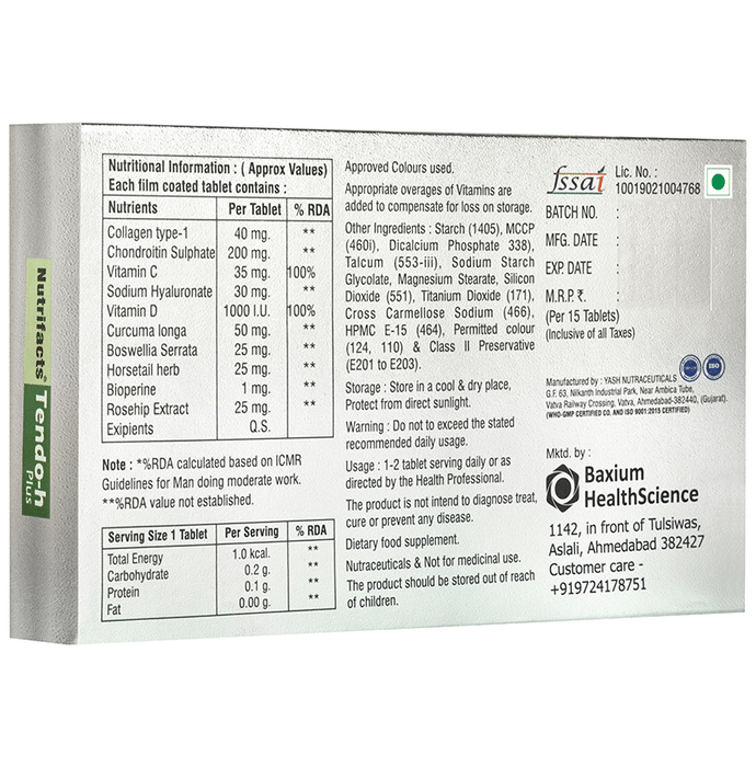 Nutrifacts Tendo-H Plus Tablet H plus tablet is a combination medicine used to aid mild to moderate hypertension. Frequent monitoring of blood pressure and electrolytes levels is necessary during treatment with this medicine. | Key Ingredients: Chondroitin sulphate Vitamin C Sodium hyaluronate Vitamin D Curcuma longa Boswellia serrata | Key Benefits: Useful to manage high blood pressure Reduces symptoms such as irregular beats and increased emotional excitability It decreases the frequency of loose stools, checks bleeding and alleviates pain It is also used in cases of hypertension without marked atheromatous changes in the vessels | Directions For Use: Use as directed on the label or as advised by your healthcare provider. | Safety Information: Read the label carefully before use Store in a cool and dry place away from direct sunlight Keep out of reach of children