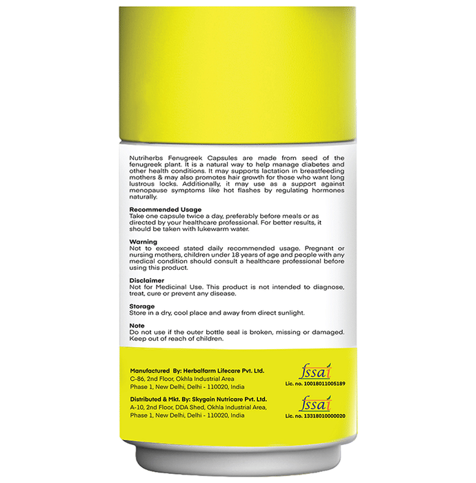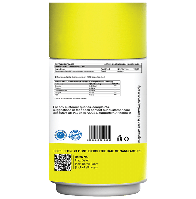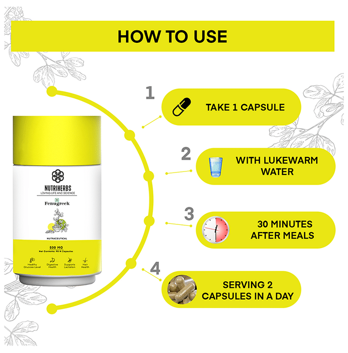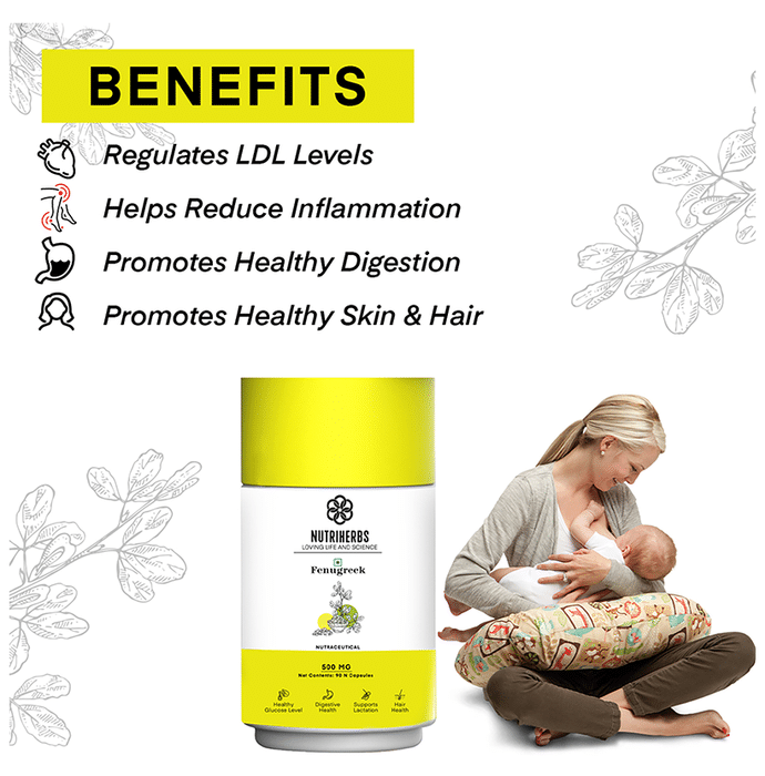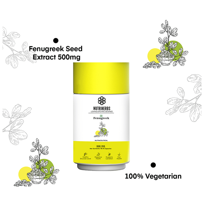Nutriherbs Fenugreek Herbal Extract 500mg Capsule is a herb with many benefits for health and well-being. It helps to improve the testosterone levels, blood sugar and provides supports in breastfeeding. | Key Ingredients: Organic Fenugreek seeds-500 mg. (Each Capsule) | Key Benefits: Excellent source that helps to regulate the circulation of blood It helps to maintain the sugar level in the blood Prevents the accumulation of fat and helps to strengthen the metabolism of lipids and glucose that help in weight loss Helps to reduce constipation and strengthens the digestive system and reduces the feeling of gas and bloating Fenugreek has anti-inflammatory properties that help to reduce the pain and inflammation Fenugreek is highly effective for hair growth due to presences of nutrient like Vitamin A, K, C Lecithin provides nourishment and strength to the hair root and hair follicles | Directions For Use Take 2 capsules of Fenugreek capsule on a daily basis For best result use with a glass of lukewarm water | Safety Information: Read the label carefully before use Store in a cool dry place away from direct sunlight Do not exceed recommended dosages as it may cause overdosing effects If you are pregnant and lactating should consult with a health practitioner before use An individual with the known medical condition should consult with a doctor before use Teenagers under 18 years of age should not take this capsule