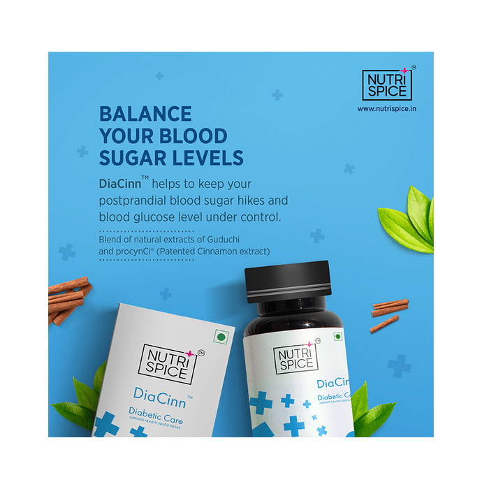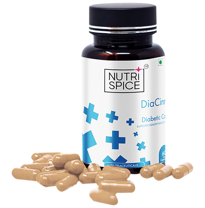 Nutrispice DiaCinn Diabetic Care Veg Capsule Nutrispice DiaCinn Diabetic Care Veg Capsule Diabetes is a condition in which the blood sugar level is high because the body is not producing sufficient insulin. The consumption of this medicine can help keep diabetes in check. It also helps in maintaining a normal blood sugar level.