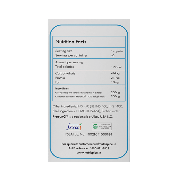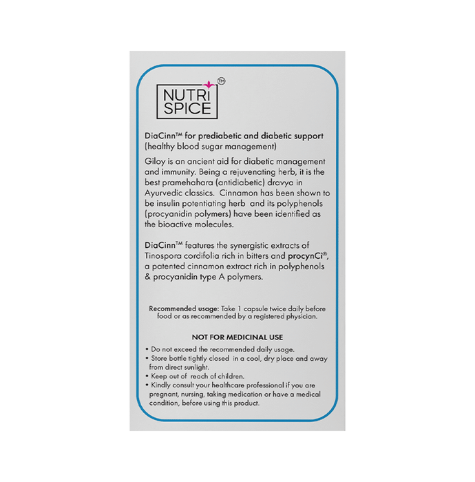 Nutrispice DiaCinn Diabetic Care Veg Capsule Diabetes is a condition in which the blood sugar level is high because the body is not producing sufficient insulin. The consumption of this medicine can help keep diabetes in check. It also helps in maintaining a normal blood sugar level. | Key Ingredients: Giloy Cinnamon Extracts | Key Benefits: Reduces insulin resistance as seen in diabetes mellitus Can help maintain normal blood sugar level May help in keeping diabetes of a person in check | Direction For Use: Take 1 capsule twice daily before food or as recommended by a registered physician. | Safety Information: Do not exceed the dosage Read the label carefully before use Pregnant women should consult their physician before use Store in a cool and dry place away from direct sunlight