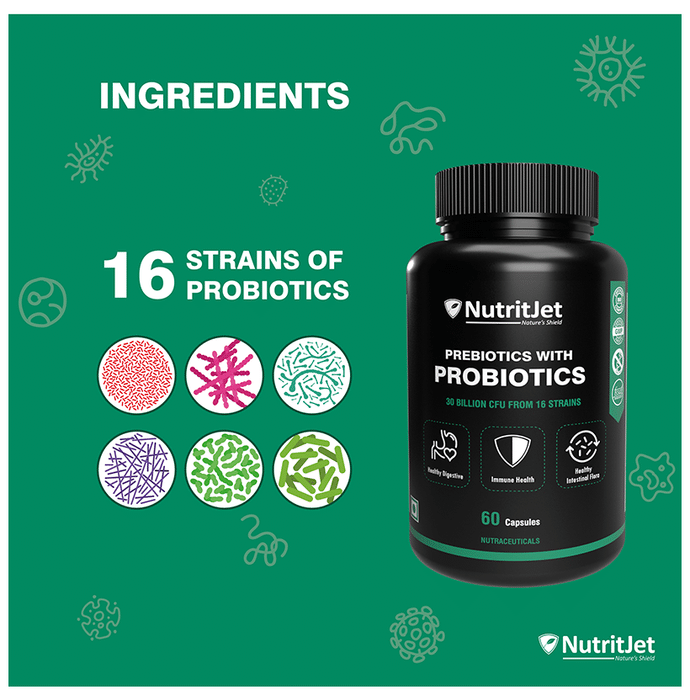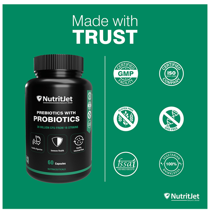 NutritJet Prebiotics with Probiotics Capsule NutritJet Prebiotics with Probiotics Capsule provides the goodness of prebiotics and probiotics. Probiotics help absorb protein in the diet as well as other vitamins and nutrients to promote healthy digestion. They also keep you healthy by promoting a healthy immune system. Besides, the formulation promotes healthy intestinal flora.