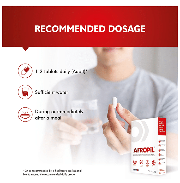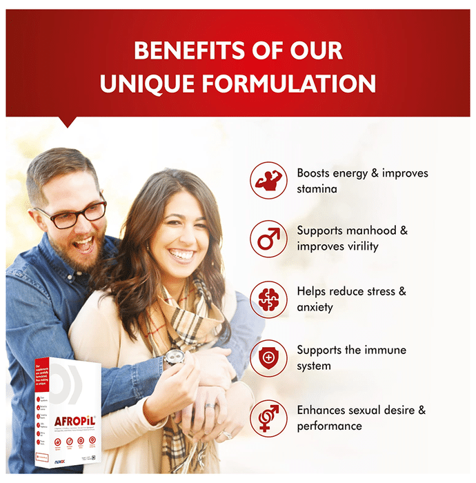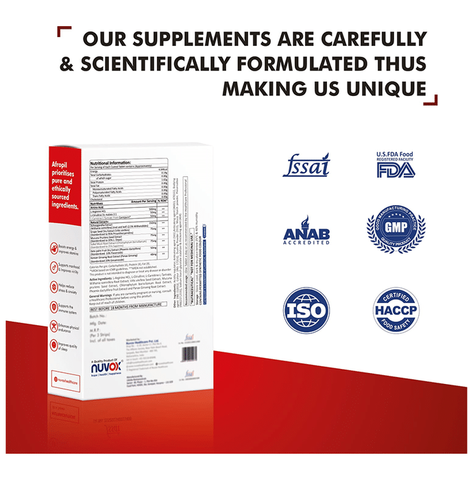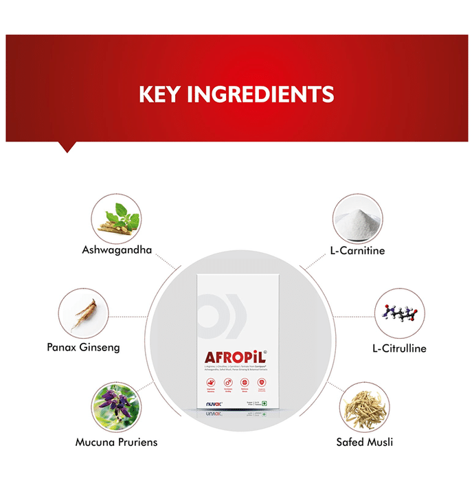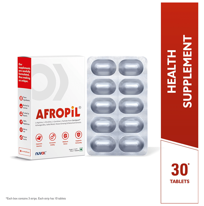 Nuvox Afropil Tablet is a natural vitality booster for men suffering from sexual dysfunction. It is made from a blend of herbal and nutraceutical ingredients that have been proven to strengthen the muscle, body tissue and vital organs, especially the reproductive system. The ingredients in the formulation are highly potent vitalizers, boost stamina, enhance performance and improve confidence. | Key Ingredients: Ashwagandha 150 mg L -arginine 500 mg Safed musli root extract 75 mg Mucuna pruriens seed extract 75 mg Vitis vinifera 75 mg L- carnitine L-tartrate 50 mg Phoenix dactylifera 50 mg L – citrulline DL malate 50 mg Ginseng panax 48 mg | Key Benefits: | L-Arginine: Regular consumption of L-Arginine is shown to ameliorate aerobic energy expenditure, possibly due to a positive effect on mitochondrial energetics. L-Arginine supplementation acts as a substrate for NO, the most potent vasodilator produced in mammals; it has been shown to improve muscle performance by increasing blood flow, therefore inducing oxygen supplementation and carbon dioxide removal, and potentiation of mitochondrial biogenesis* | Withania Somnifera Root Extract: Study suggests that Withania somnifera reduces the feeling of stress and anxiety. The therapeutic activity of Withania somnifera may be attributed to its effect on the Hypothalamic-pituitary-adrenal axis, which regulates serum cortisol concentration. Withania somnifera significantly lowers the stress hormone cortisol, eases stress and anxiety, and thus improves general well-being. We are also aware that stress is directly co-related to depleted sexual behaviour* | Vitis Vinifera Seed Extract: The antioxidant capacity of Grape seed extract has been widely studied, and it has a very high antioxidant activity and is capable of inhibiting lipid oxidation and reactive oxygen species scavenging. This high antioxidant capacity in grapes is probably due to the presence of a high amount of catechin, gallic acid, epicatechin, proanthocyanidin, and procyanidins. The antioxidant activity of phenolic compounds mainly involves two mechanisms i.e. metal chelating properties along with their effect on signal pathways and on gene expression and free radical scavenging* | Mucuna Pruriens Seed Extract: Mucuna Pruriens seed extract helps improve sexual desire, libido and performance. Mucuna pruriens on administration shows improvement in sexual activity. This activity is due to stimulating action on testosterone hormone levels* | Safed Musli Root Extract: It is popularly known for its aphrodisiac activity. This activity of the herb is attributed to the presence of a high concentration of saponins* | Phoenix dactylifera fruit Extract: A study shows that Phoenix dactylifera fruit Extract constitutes a natural source of potent antioxidants that may prevent many ailments caused by free radicals and could potentially be used in food and nutraceutical formulations* | Panax Ginseng Root Extract: It has been used in the management of various physical conditions for thousands of years in the traditional medicine system, importantly as an aphrodisiac and is used in the management of sexual dysfunction as well as to enhance sexual behaviour and gonadal functions* | Directions For Use: Take one tablet daily with water after meals or as directed by the healthcare professional. | Safety Information: Read the label carefully before use Store in a cool and dry place away from direct sunlight Keep out of reach of the children Do not exceed the recommended dosage