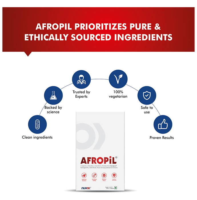 Nuvox Afropil Tablet Nuvox Afropil Tablet is a natural vitality booster for men suffering from sexual dysfunction. It is made from a blend of herbal and nutraceutical ingredients that have been proven to strengthen the muscle, body tissue and vital organs, especially the reproductive system. The ingredients in the formulation are highly potent vitalizers, boost stamina, enhance performance and improve confidence.