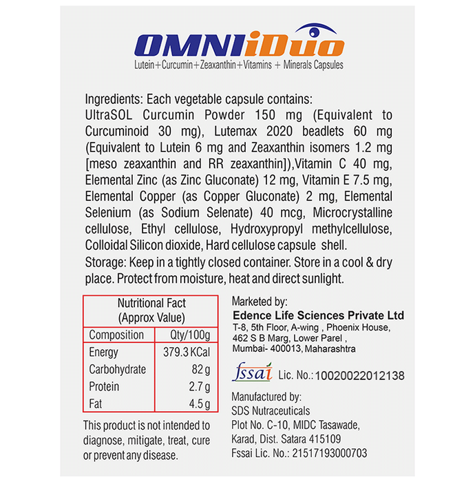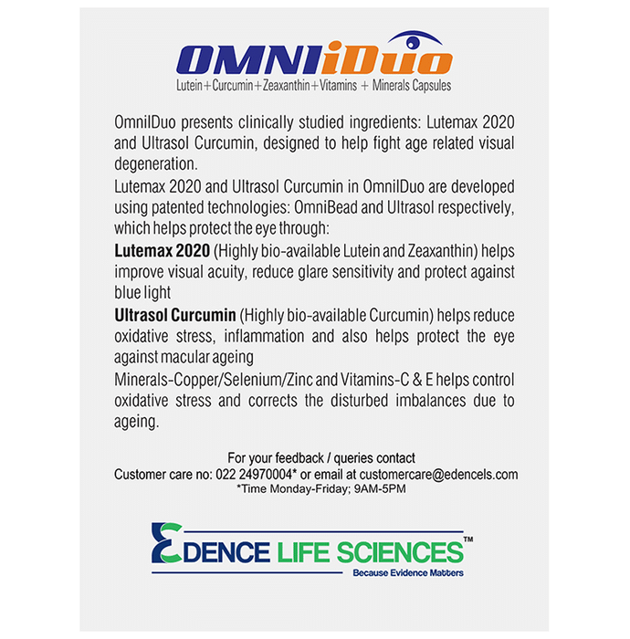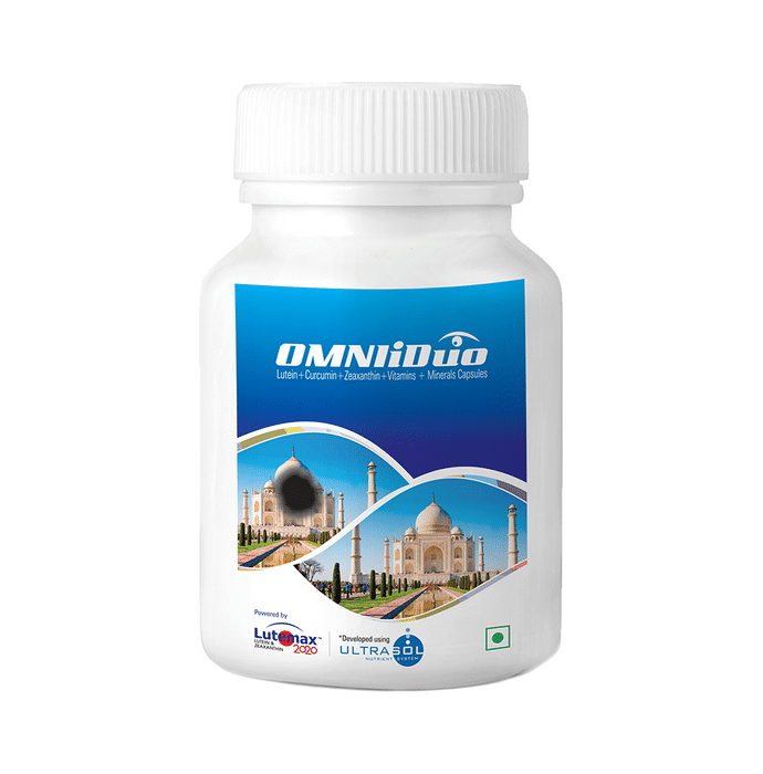 OMNI i Duo Capsule is designed to help fight age-related visual degeneration such as macular degeneration and also to helps protect the eye from blue light radiation. It can also be used for conditions such as glare sensitivity and contrast sensitivity. | Key Ingredients: Lutein with RR and RS isomers Curcumin Meso-zeaxanthin Vitamins Minerals | Key Benefits: It improves the visual performance and acuity Helps to reduce the glare sensitivity and improves the vision in dim light and protects against blue light Aids in reducing the oxidative stress and inflammation It also helps to protect the eye against macular ageing | Directions For Use: Take 1 capsule daily or consume as directed by the physician | Safety Information: Read the label carefully before use Keep it out of reach of the children Store in a cool and dry place away from direct sunlight Use under medical supervision Do not exceed the recommended dose