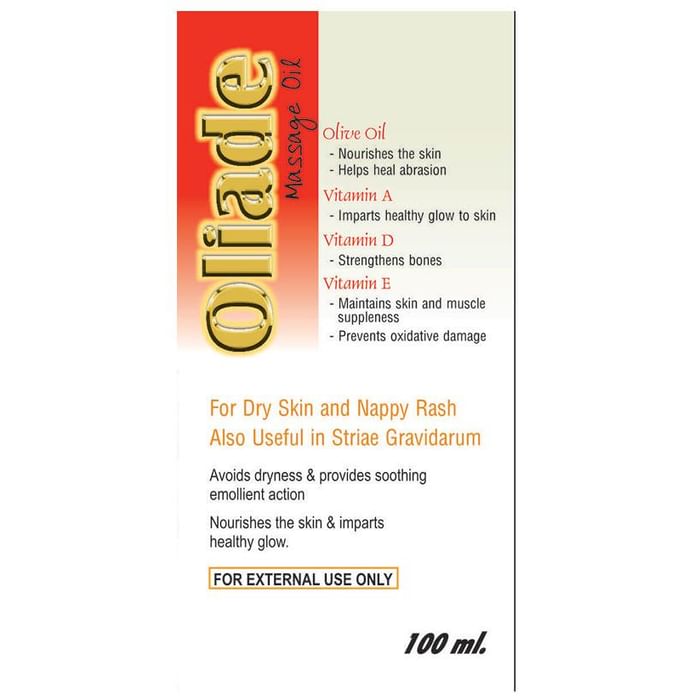 Oliade Massage Oil Oliade Oil is a bath oil used for the nourishment of skin and underlying tissues. Body massage with the oil initiates circulation and blood flow in the body. The oil is composed of Olive oil, Vitamin A, Vitamin D, Arachis oil and Vitamin E. Together the oil provides good health and glow to the skin. Olive oil adds to the suppleness of the skin. They improves skin texture, reconditions it and moisturizes without clogging the pores. The oil nourishes the skin by healing the abrasions in the skin. Vitamin D strengthens the bones whereas Vitamin E prevents the oxidative damage and serves as the storehouse to provide the skin and bones with the needed supplements. Arachis Oil energizes the body and serves as a remedy for problems in the joints. Use under medical supervision