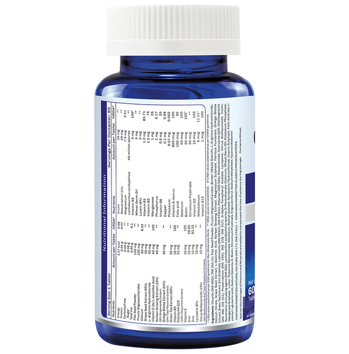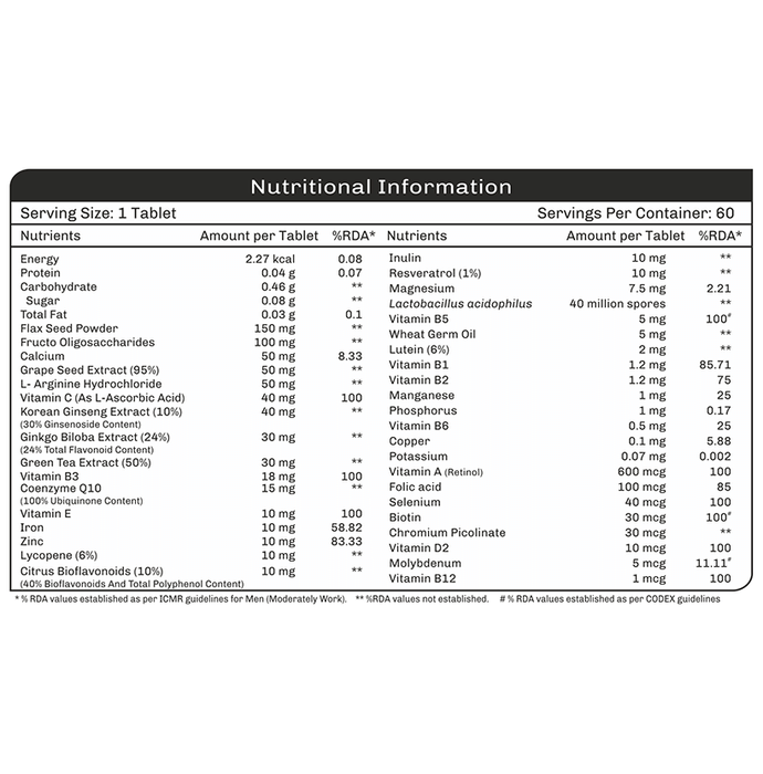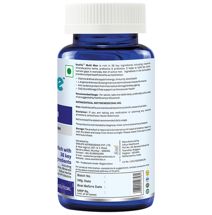 OneLife Multi-Man Tablet is a perfect blend of nature and science, rich in 38 key ingredients including, vitamins, minerals, active herbs, omega 3 fats, antioxidants, pre and probiotics. It helps to fulfil the micro-nutrient requirements of active men that are missing in today's fast-paced lifestyle and helps improve metabolism, stamina and strengthens immunity. It also promotes vitality in men and is a must for today's multifaceted man. It is specially formulated for the active man and takes care of the daily nutrition requirement along with energy and immunity-boosting properties. | Key Ingredients: Calcium Ashwagandha root extract Magnesium Shatavari root extract Korean ginseng powder Bacopa monnieri extract Omega 3 Vitamin A,C,E,B5,B6,B1,B12,D3 Gotu kola extract Pumpkin seed extract powder Liquorice root powder Tribulus root extract Turmeric extract Holy basil extract Triphala fruit extract powder Fennel seed extract Niacinamide Clove bud extract Cardamom seed extract Potassium Piper longum powder Biotin Folic acid Chromium Selenium Molybdenum | Key Benefits: It is rich in 38 key ingredients including vitamins, minerals, anti-oxidants, active herbs, prebiotic and probiotic It helps in elevated energy and vitality, enhanced immunity, bone health and heart health Vitamin B complex and other nutrients improve the energy levels, memory, skin, hair health and stimulates the immune system Anti-oxidants like Resveratrol, Grape seed extract, Lycopene, Green tea extract, Citrus Bioflavonoids, Ginseng, Vitamin E and Vitamin C protects from the free radical damage Zinc and Vitamin C improves the immunity CoQ10 and Omega 3 fats have protective cardiovascular health benefits L-Arginine and Korean Ginseng improves blood circulation and stamina and helps in boosting immunity Special formulation considering Indian active man's daily nutrition needs in mind Manufactured under quality standards of GMP, HACCP and ISO and complies with regulatory guidelines | Directions For Use: For adults, take one tablet daily, preferably with the meal or as suggested by the healthcare professional. | Safety Information: Read the label carefully before use Do not exceed the recommended dose Keep out of the reach of children Store in cool and dry place Should be protected from direct light