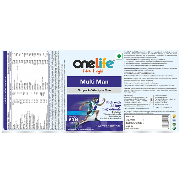 OneLife Multi Man Tablet OneLife Multi-Man Tablet is a perfect blend of nature and science, rich in 38 key ingredients including, vitamins, minerals, active herbs, omega 3 fats, antioxidants, pre and probiotics. It helps to fulfil the micro-nutrient requirements of active men that are missing in today's fast-paced lifestyle and helps improve metabolism, stamina and strengthens immunity. It also promotes vitality in men and is a must for today's multifaceted man. It is specially formulated for the active man and takes care of the daily nutrition requirement along with energy and immunity-boosting properties.
