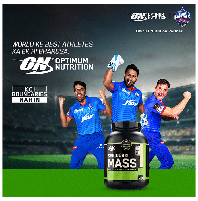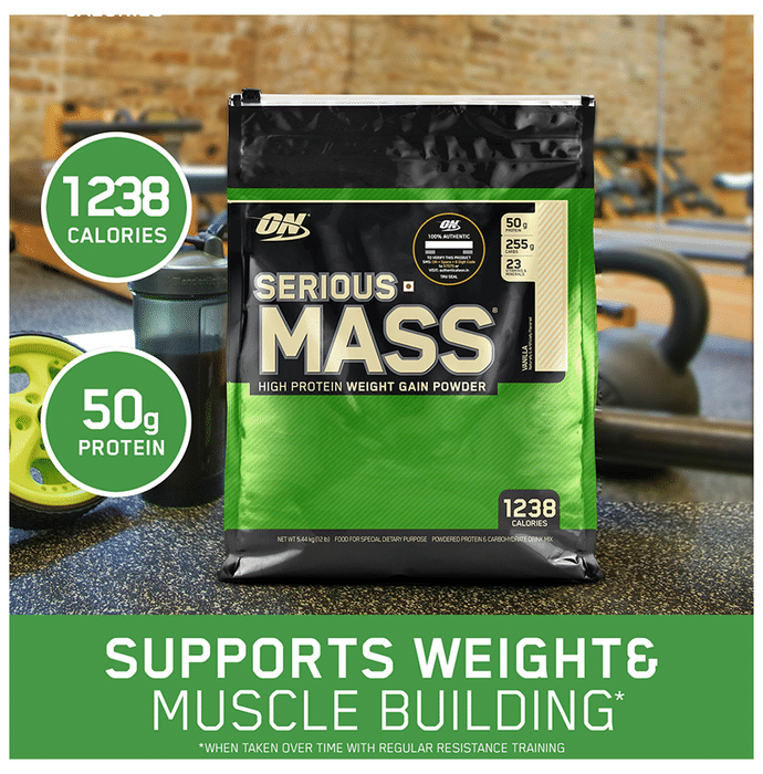 Optimum Nutrition (ON) Serious Mass High Protein Weight Gain Powder Vanilla Optimum Nutrition (ON) Serious Mass Weight Gain Powder Vanilla is the ultimate weight gain and muscle building formula. With +1200 calories per 2-scoop serving and 50 grams of protein to support muscle recovery, this powder makes the ideal post-workout and between meals shake for sizing up your goals. Serious mass provides you with the tools you need to support your weight gain goals. Authenticity - SMS ON 6 digit unique code on the pack to 57575 or visit our website Authentication.in to instantly check the authenticity of the product