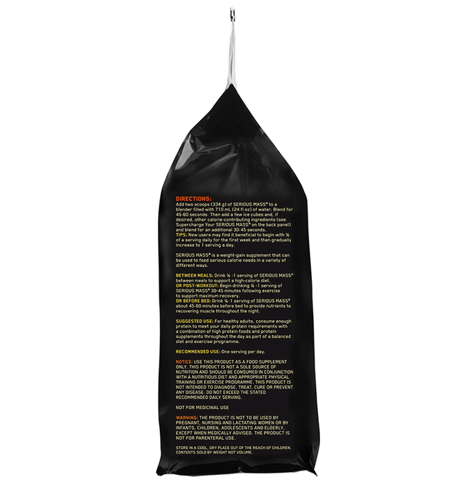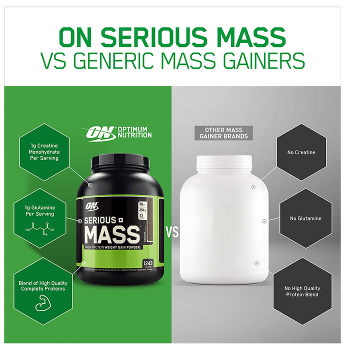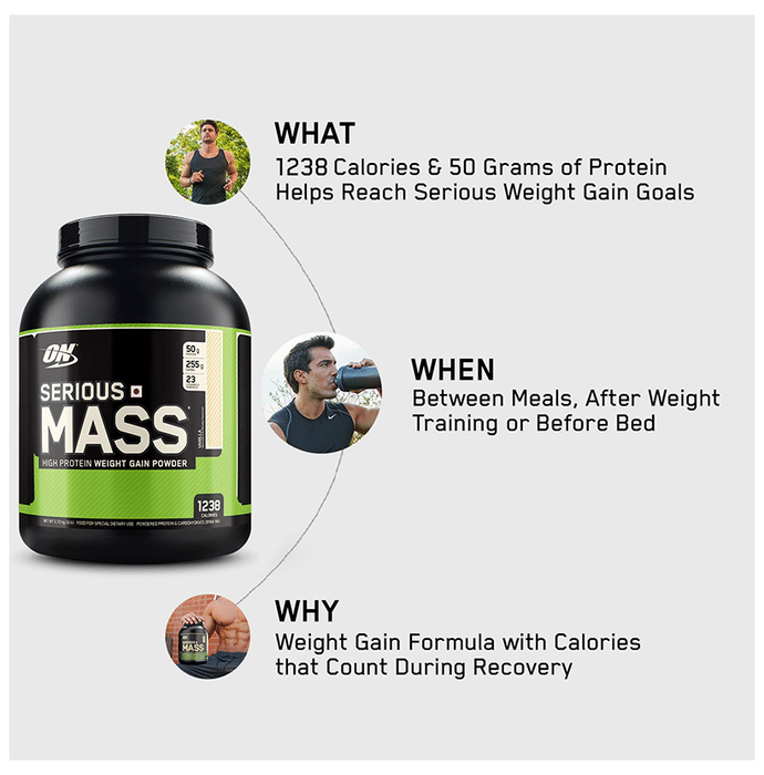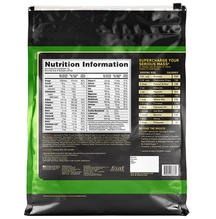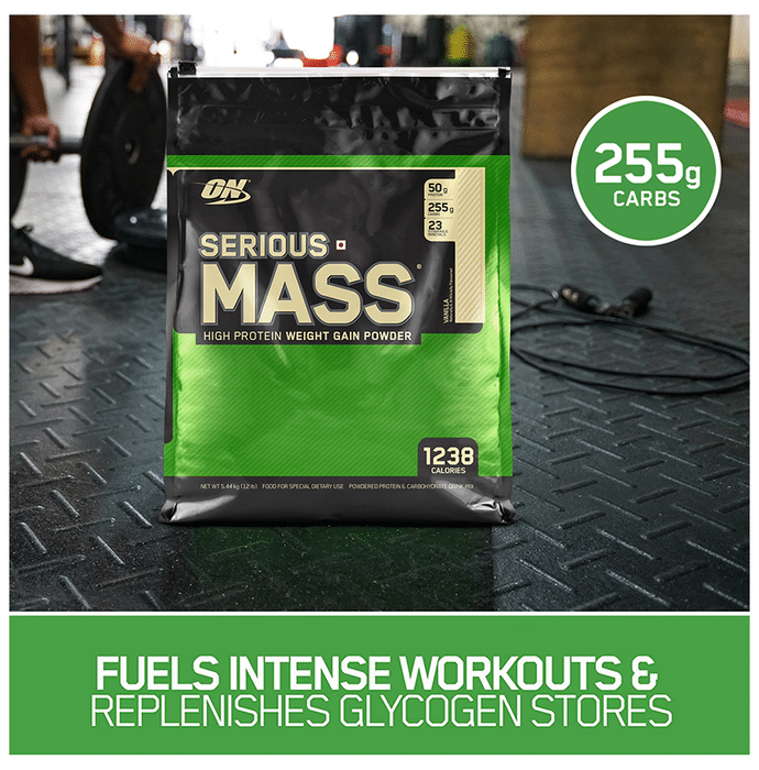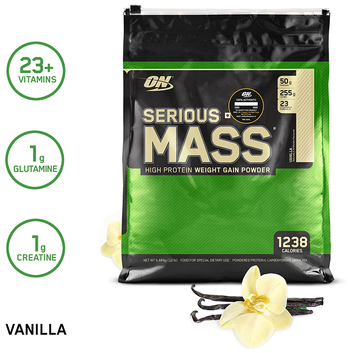Optimum Nutrition (ON) Serious Mass Weight Gain Powder Vanilla | is the ultimate weight gain and muscle building formula. With +1200 calories per 2-scoop serving and 50 grams of protein to support muscle recovery, this powder makes the ideal post-workout and between meals shake for sizing up your goals. Serious mass provides you with the tools you need to support your weight gain goals. Authenticity - SMS ON 6 digit unique code on the pack to 57575 or visit our website Authentication.in to instantly check the authenticity of the product | Key Ingredients: Maltodextrin Protein Blend (Whey Protein Concentrate, Calcium Caseinate, Egg Albumen, Sweet Dairy Whey) Vitamins and mineral blend Soy lecithin Flavours Inositol Creatine monohydrate MCT | Key Benefits: 1200+ calories per serving to help boost calorie intake 50 grams of protein per serving to help build and maintain muscle 250+ grams of carbohydrates per serving to help fuel workouts. 1 gram creatine monohydrate, 1 gram glutamine, and 24 vitamins and minerals per serving Who needs serious mass: people with very active metabolism that struggle to gain weight, athletes or anyone who has extremely high energy needs that can not be met only with food. | Direction For Use: Mix 2 scoops of the powder into 24 fluid ounces (710ml) of cold water or milk using an electric blender. This allows you to add in fruits, peanut butter and other calorie-contributing foods TIP: New users should start with a 1-scoop half serving. Use post-workout and/or between meals to add calories, carbs and protein to your healthy, balanced diet | Safety Information: Not to be used by children, pregnant/lactating women, infants, adolescents and elderly except when medically advised Contains artificial sweetener Store in a cool and dry place away from direct sunlight Keep out of reach of children Read the label carefully before use This product is not for parenteral use Do not exceed the recommended dosage