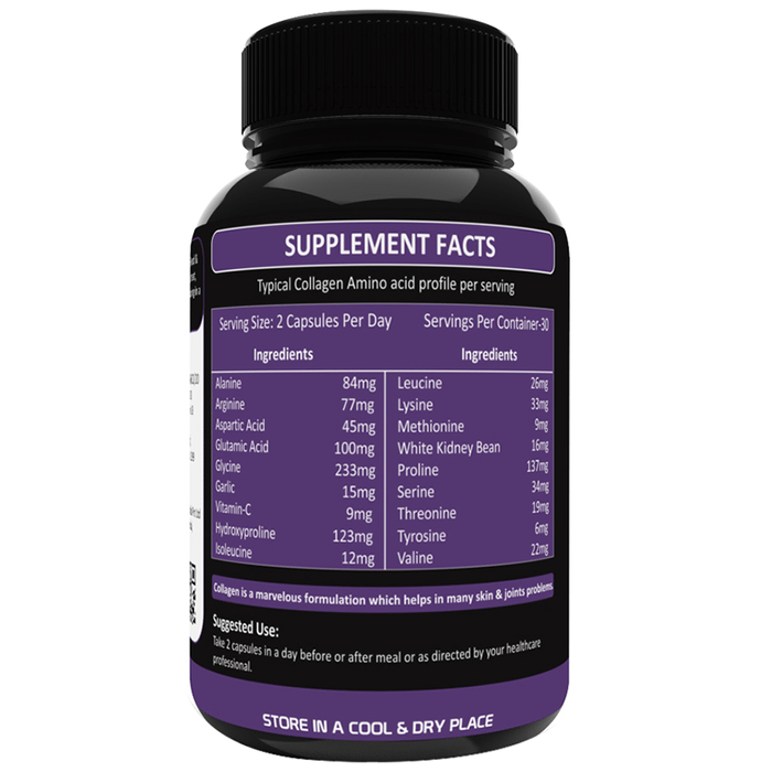 Organic Vasi Collagen Capsule is a unique formulation for nurturing the body with essential nutrients. It acts as a daily supplement for people looking to improve skin health and enhance bones health. It not only replenishes but also strengthens the body in a natural way. | Key Ingredients: Alanine Arginine Aspaetic acid Glutamic acid Glycine Garlic Vitamin C Hydroxyproline Isoleucine Leucine Lysine Methionine White kidney beans Proline Serine Threonine Ttyrosine | Key Benefits: Collagen tablets help burn the fat that gets accumulated in the crevices of the body It helps in boosting the body's metabolic rate, thus maintaining energy throughout the day The tablet helps improve digestion and the overall digestive health as it works on the production of acid found in the stomach, thus increasing the body's ability to absorb food These tablets are used in improving the elasticity and maintaining the moisture content in the skin Collagen tablets promote hair growth and prevent damage These can also be used to provide strength to the muscles | Directions For Use: Take two capsules a day before or after a meal or as directed by your healthcare professional. | Safety Information: Read the label carefully before use Do not exceed the recommended dosage Keep it away from the reach of children