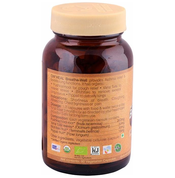Organic Wellness OW'HEAL Breathe-Well Capsule is an asthma relief supplement which is made with organically cultivated Pushkarmool, Vana Tulsi, Bibhitaki and Pipali. It is indicated during shortness of breath, coughing, wheezing, chest tightness and chest pain. It is basically a decongestant that helps in respiratory allergies, removes excess lung mucus and detoxifies the lungs. | Key Ingredients: Pushkarmool root (Inula racemosa) Vana Tulsi leaves (Ocimum gratissimum) Bibhitaki fruit (Terminalia bellerica) Pippali fruit (Piper longum) | Key Benefits: Provides relief from asthma and bronchitis Naturally boosts the lung functions Helps in decongestion allowing to breathe freely Helps against respiratory allergies Helps to repair the lung tissues Pushkarmool is used for cough relief Vana Tulsi is used to relieve stress Bibhitaki removes excess lung mucus Pippali is used to detoxify the lungs | Directions For Use: Take 1-2 capsule with food and water twice a day for at least 3 months or as directed by the physician | Safety Information: Read the label carefully before use Do not exceed the daily recommended dosage To be used under medical supervision only Keep out of reach of children Store in a cool, dry place, away from direct heat and sunlight Safe for long term use