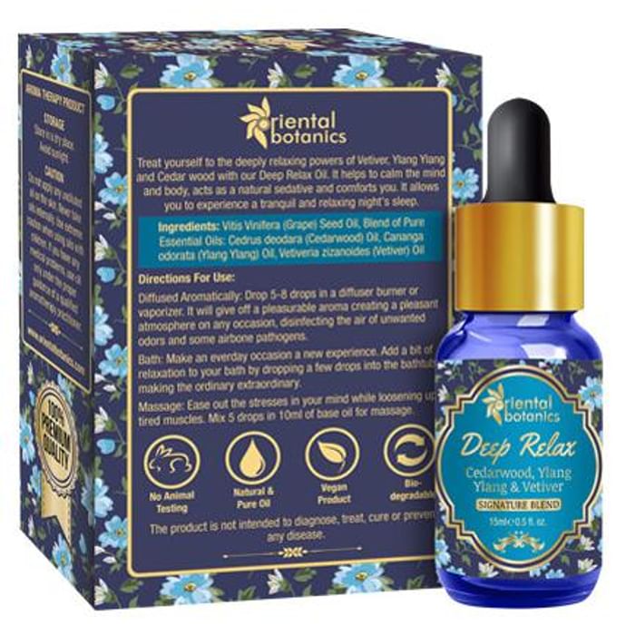 Oriental Botanics Deep Relax Aroma Therapy Diffuser Oil contains Vitis Vinifera (Grape) Seed Oil, Blend of Pure Essential Oils: Cedrus deodara (Cedarwood) Oil, Cananga odorata (Ylang Ylang) Oil, Vetiveria Zizanoides (Vetiver) Oil - Deeply relaxing powers of Vetiver, Ylang Ylang and Cedarwood - Helps to calm the mind and body Key benefits/uses of Oriental Botanics Deep Relax Aroma Therapy Diffuser Oil: - Acts as a natural sedative - Allows to experience a tranquil and relaxing night's sleep - Ease out the stresses in mind while loosening up tired muscles - Relaxation to your bath - Will give off a pleasurable aroma creating a pleasant atmosphere on any occasion, disinfecting the air of unwanted odors and some airborne pathogens - Aromatherapy - Custom Massage and Body Oils, Vaporizers, Diffusers, Oil Burners, Inhalation, Perfume, Blends, Spa and Home Care Direction for use/Dosage: - Diffused Aromatically: Drop 5-8 drops in a diffuser burner or vaporizer - Bath: Dropping a few drops into the bathtub - Massage: Mix 5 drops in 10ml of base oil for massage Safety information: - Read the label carefully - Keep out of reach of children - Do not exceed the recommended dose
