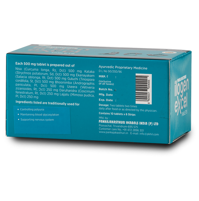 Pankajakasthuri Ilogen Excel Tablet rejuvenates damaged cells of pancreatic islets and strengthens them to produce insulin and also helps to eliminate the common symptoms associated with diabetes like numbness in hands & legs, tiredness, excess thirst, frequent urination, physical weakness etc. Ilogen Excel not only rejuvenates Islet cells but protects liver and kidney for better functioning. | Key Ingredients: Rajani Kataka Ekanayakam Guduchi Usheera Darvi Bhunimba Lajjalu | Key Benefits: Traditionally used in Diabetes Mellitus for rejuvenating pancreatic islets Maintaining Healthy Blood sugar level Controlling excess thirst, frequent urination, physical weakness Managing blood glycosylation Supporting the nervous system to prevent neuritis and retinopathy | Directions For Use Take 2 tablets 2 times daily or as directed by the physician. To be taken regularly according to the severity and duration of disease. ILOGEN EXCEL should be taken along with the allopathic drugs presently being used at the initial stages of treatment. After one month of treatment, glucose level should be tested. If glucose level has lowered, the dosage of allopathic medicines can be reduced and tapered off. This should be done only under the supervision of the physician. | Safety Information: Read the label carefully before use Keep away from the children Traditionally used in Diabetes Mellitus Store in a cool and dry place