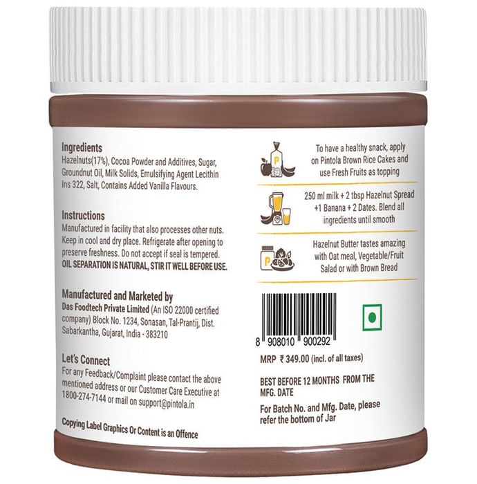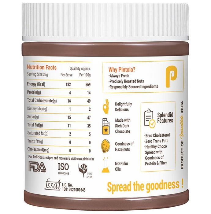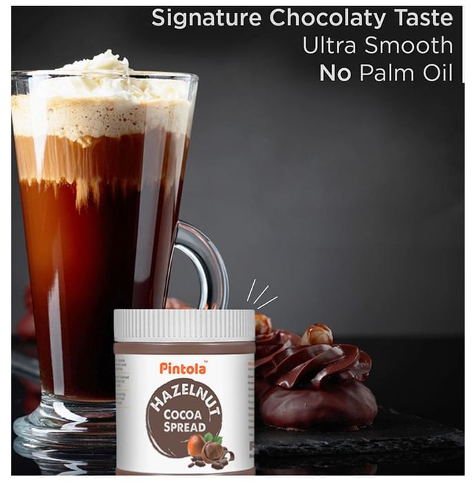 Pintola Hazelnut Cocoa Spread tastes like melted chocolates. The heavenly taste and buttery smoothness of Pintola’s Hazelnut Cocoa Spread is healthy. | Key Ingredients: Hazelnuts(17%) Cocoa Powder and additives Sugar Groundnut Oil Milk Solids Emulsifying Agent Lecithin Ins 322 Salt Contains added vanilla flavours | Key Benefits: Goodness of hazelnuts Made with groundnut oil making it healthy and smooth Contains Vitamin K, E and B6 | Directions For Use: Use as directed. | Safety Information: Read the label carefully before use Store in a cool dry place away from direct sunlight Keep out of reach of the children