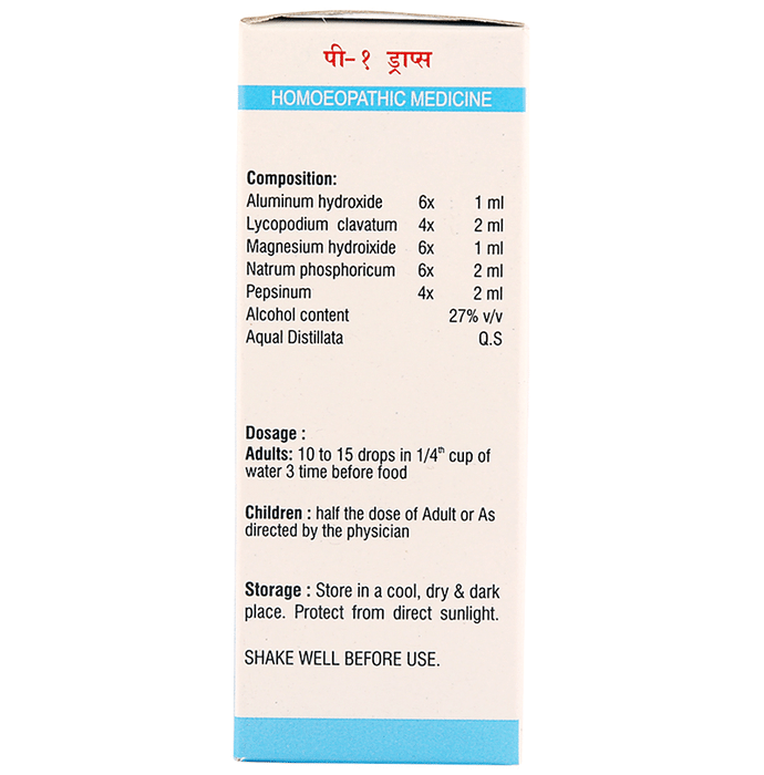 Pioneer Pharma P1 Acidity Drop is a homoeopathic remedy to offer ease from acute and chronic gastritis, sensation in the throat related to digestion problems, stomach ache and gas problems. | Key Ingredients: Aluminum hydroxide 6x 10 ml Lycopodium clavatum 4x 20 ml Magnesium hydroxide 6x 10 ml Natrum phosphoricum 6x 20 ml Pepsinum 4x 20 ml Alcohol content 27% v/v Aqua Distillate Q.S | Key Benefits: It helps prevent belching, bloating and gas problems It also alleviates stomach ache and pain due to indigestion It aids in heartburn and acute and chronic gastritis problem | Directions For Use: Adults: 10 to 15 drops in a quarter cup of water 3 to 4 times a day Children: half the dosage of adults or as advised by the physician | Safety Information: Read the label carefully before use Keep out of reach of children Store in a cool and dry place away from direct sunlight