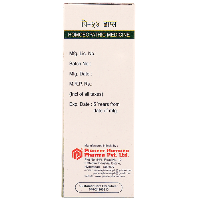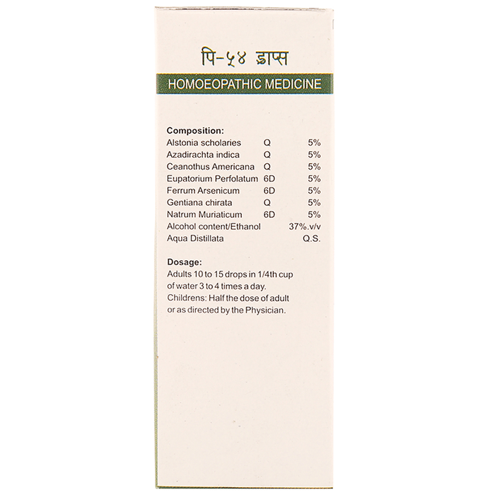 Pioneer Pharma P54 Malaria Drop is a homoeopathic medicine used in the treatment of malaria that includes the symptoms of intermittent and remittent fever, chills and shivers, restlessness and weakness. | Key Ingredients: Alstonia scholaris Q 5% Azadirachta indica Q 5% Ceanothus Americanus Q 5% Eupatorium Perfoliatum 6D 5% Ferrum Arsenicum 6D 5% Alcohol content/Ethanol 37%.v/v Acqua Distillata Q.S. | Key Benefits: It helps with malarian, intermittent and remittent fever It is also used for other symptoms like chills, shivers, weakness and enlarged spleen and liver | Directions For Use: Adults: 10 to 15 drops in a quarter cup of water 3 to 4 times a day Children: half the dosage of adults or as advised by the physician | Safety Information: Read the label carefully before use Keep out of reach of children Store in a cool and dry place away from direct sunlight