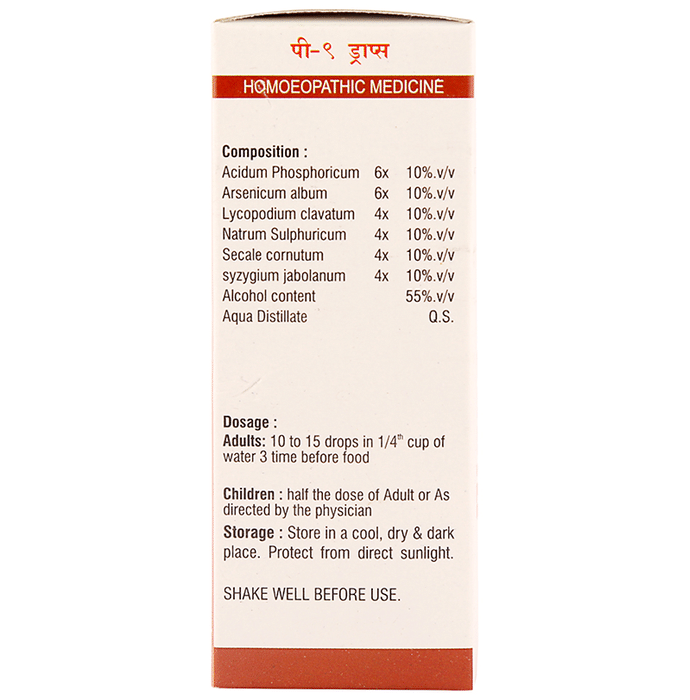 Pioneer Pharma P9 Sugar Nil Drop is a homoeopathic medicine that rectifies the abnormal metabolism of carbohydrates and elevated levels of glucose in the blood. | Key Ingredients: Acidum Phosphoricum 6x 10%.v/v Arsenicum album 6x 10%.v/v Lycopodium clavatum 4x 10%.v/v Natrum Sulphuricum 4x 10%.v/v Secale cornutum 4x 10%.v/v Syzygium jambolanum 4x 10%.v/v Alcohol content 55%.v/v Aqua Distillate Q.S. | Key Benefits: It rectifies the abnormal metabolism of carbohydrates It also normalizes the elevated levels of glucose in the blood | Directions For Use: Adults: 10 to 15 drops in a quarter cup of water 3 to 4 times a day Children: half the dosage of adults or as advised by the physician | Safety Information: Read the label carefully before use Keep out of reach of children Store in a cool and dry place away from direct sunlight