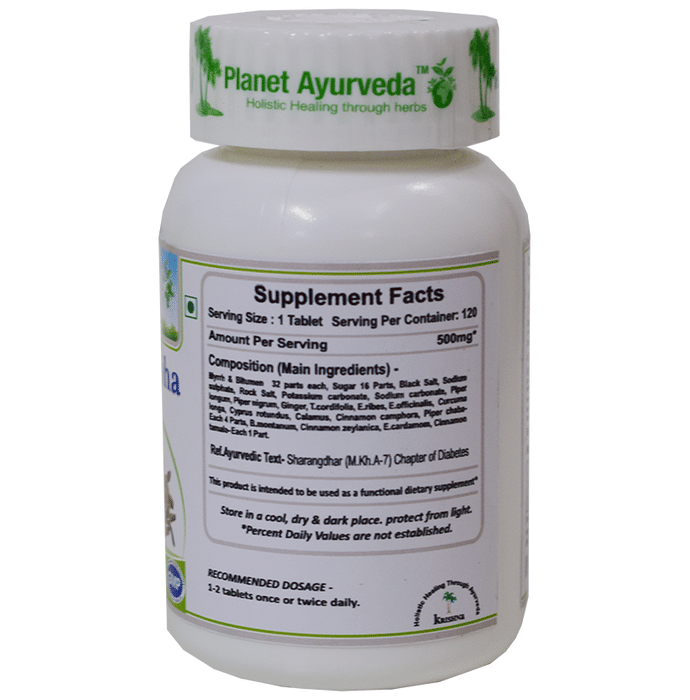 Planet Ayurveda Chandraprabha Vati is a classical ayurvedic medicine prescribed in ancient ayurveda for both men and women. In men, it is used as a herbal remedy for erectile dysfunction, premature ejaculation, other urinary tract infections, emotional stress, diabetes and complications like diabetic neuropathy. In females, it is helpful in overcoming general weakness, reducing pain in the lower back, treatment of ovarian cysts, irregular mensuration, urinary tract infections and lack of glow on the face. | Key Ingredients: Shilajit (Asphaltum) - 32 Parts Guggul (Commiphora mukul) - 32 Parts Sharkara (Sugar) - 16 Parts Karpoor (Cinnamomum camphora) - 4 Parts Vacha (Acorus calamus) - 4 Parts Mustak (Cyprus rotundus) - 4 Parts Haridra (Curcuma longa) - 4 Parts Amala (Emblica officinalis) - 4 Parts Chavya (Piper chaba) - 4 Parts Vidanga (Embelia ribes) - 4 Parts Giloy (Tinospora cordifolia) - 4 Parts Shunthi (Zingiber officinalis) - 4 Parts Maricha (Piper nigrum) - 4 Parts Pippali (Piper longum) - 4 Parts Sarjikashaar (Sodium carbonate) - 4 Parts Yavkshaar (Potassium carbonate) - 4 Parts Saindhav Lavan (Rock salt) - 4 Parts Suvarchal Lavan (Sodium sulphate) - 4 Parts Vida Lavan (Balck salt) - 4 Parts Danti (Baliospermum montanum) - 1 Part Dalchini (Cinnamomum zeylanicum) - 1 Part Tejpatta (Cinnamomum tamala) - 1 Part Ela (Elettaria cardamomum) - 1 Part | Key Benefits: Chandraprabha exerts calming effect on the body and is one of the most potent adaptogens and acts as a stress buster Assists in treating problems related to the male and female reproductive system Effective in treating diabetic neuropathy, weakness, pain in legs, back and neck and vertigo Allows you to lose excess body fat and is good for cellulite treating people with obesity Good for building muscles, strength and stamina Consuming the recommended dosage, chandraprabha helps to increase liver functioning and improve the general activity It may help to shrink ovarian cysts, fibroids and prostate glands The tablet is a source of cleaning the blood, that causes oxygenation of the blood and further provides greater vitality Chandraprabha tablets can reduce insulin resistance by 88% by increasing the burning of glucose and enhancing the uptake of glucose into the cell | Directions For Use: Take 1-2 tablets twice daily with lukewarm water or take as directed by the healthcare professional. | Safety Information: Read the label carefully before use Keep out of reach of the children Store in a cool dry place