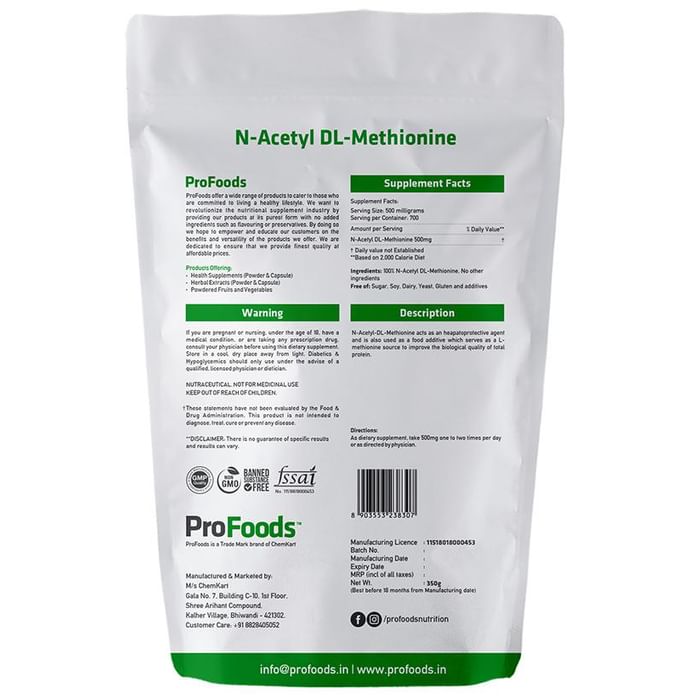 ProFoods N-Acetyl DL-Methionine Powder ProFoods N-Acetyl DL-Methionine Powder is advanatageous to consume as it has many benefits such as preventing liver damage and improve acidity of urine. It is helpful in treating Asthma and aids healing of wounds.
